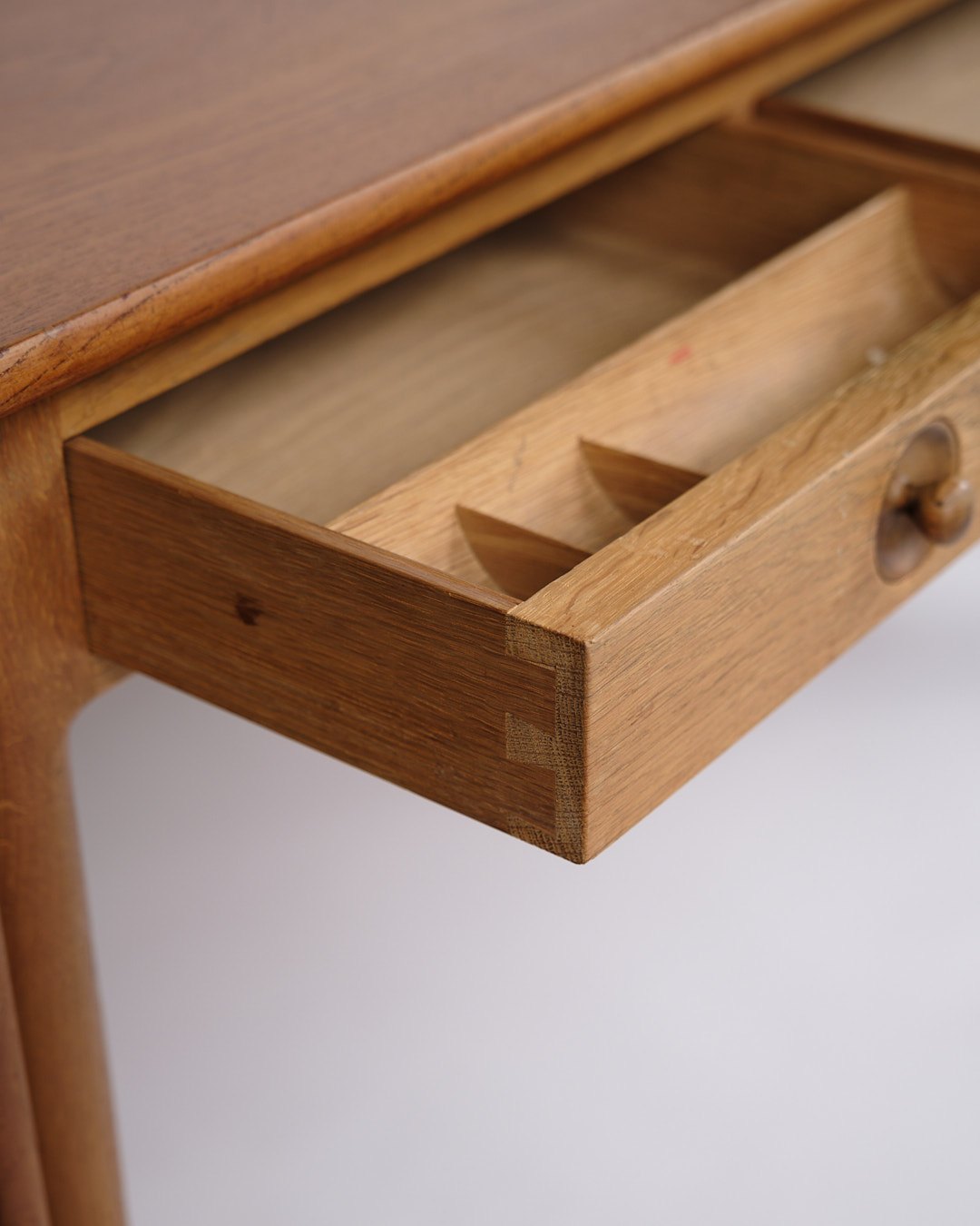 Kontakt os vedrørende prisSkrivebord med klapper, model AT-305, designet af Hans J. Wegner og produceret af Andreas Tuck i 1950’erne. Bordet er udført i teak med ben i eg og kan udvides fra 135 cm til hele 229 cm ved hjælp af to klapper, hvilket gør det både funktionelt og fleksibelt.