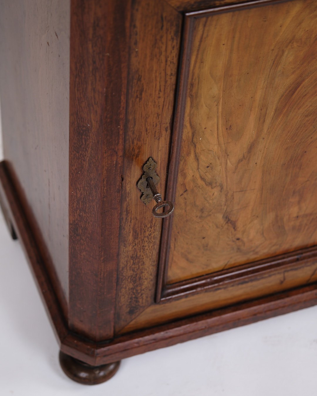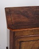 Lille antikt konsol-/entréskab fra 1880’erne. Mahogni og nøddetræ med runde ben.