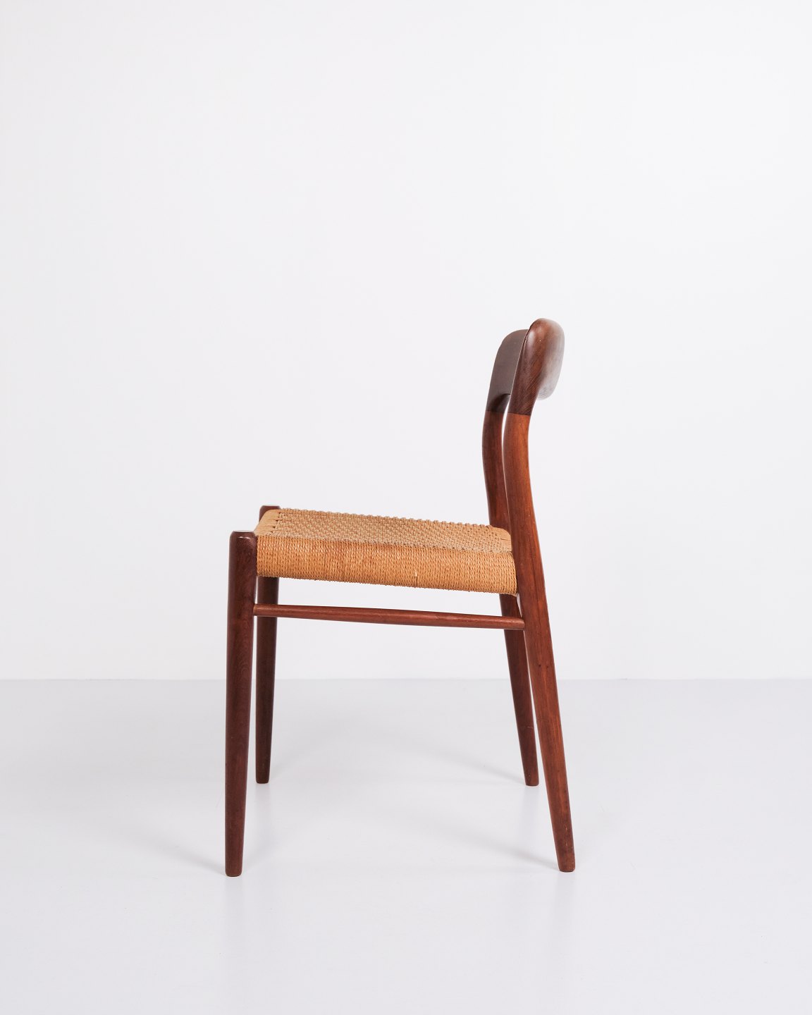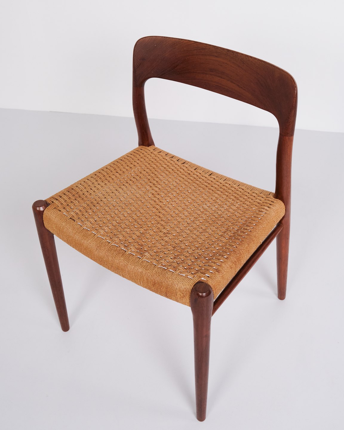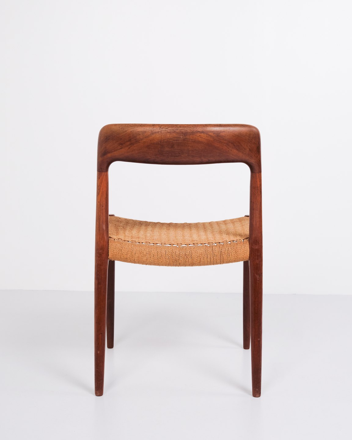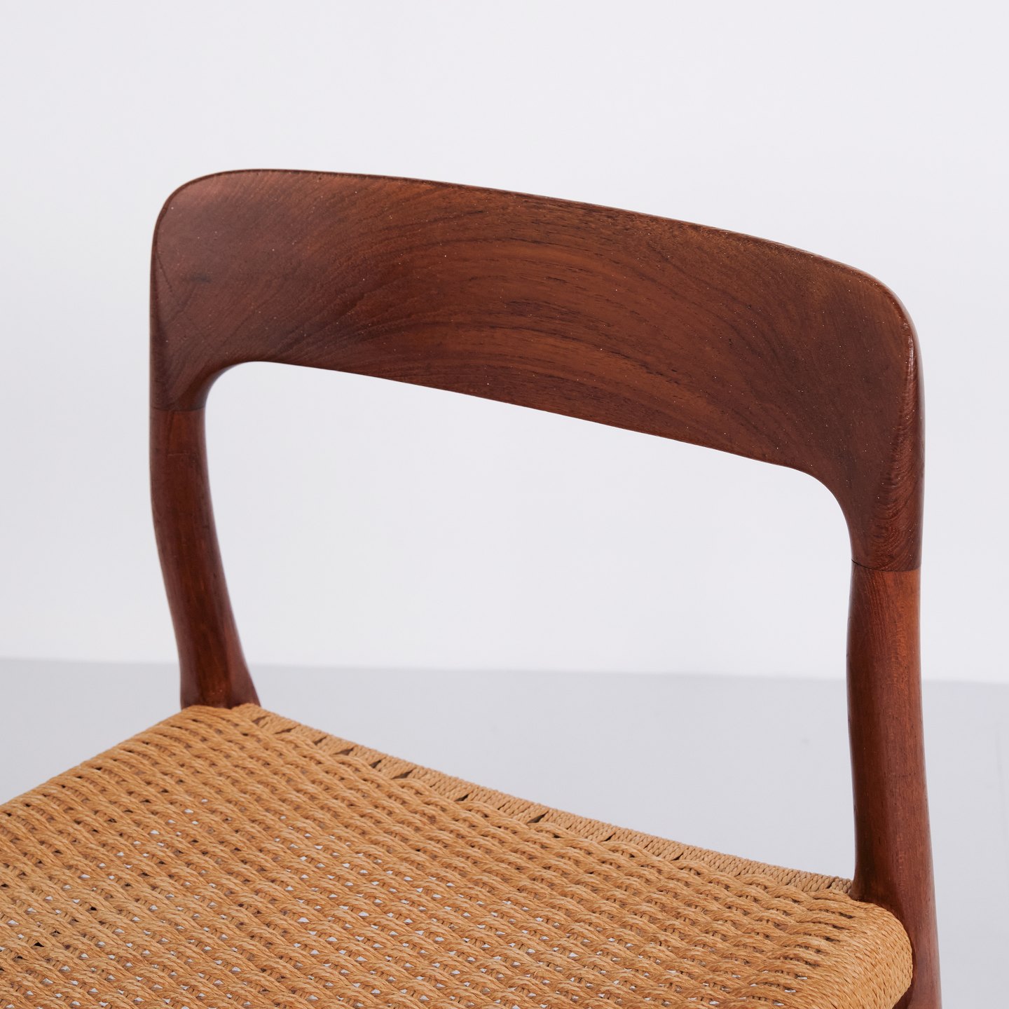 Sæt af Fem N.O. Møller spisebordsstole, model 75. Teak og papirflet, 1960’erne.