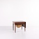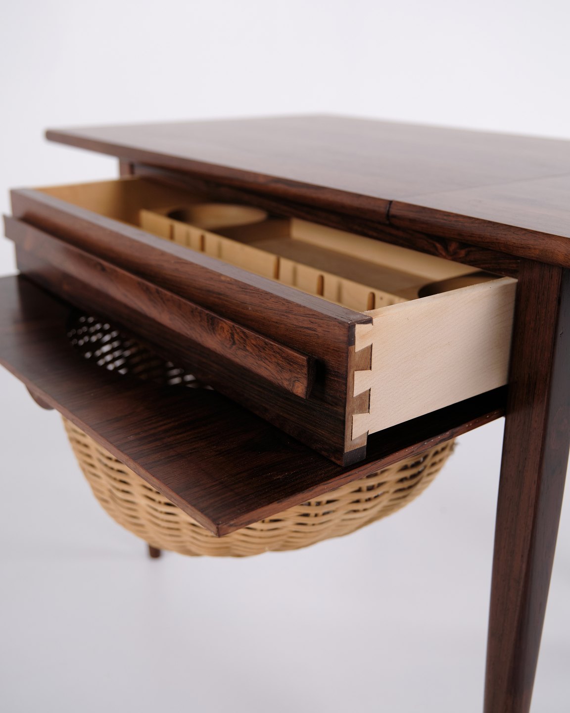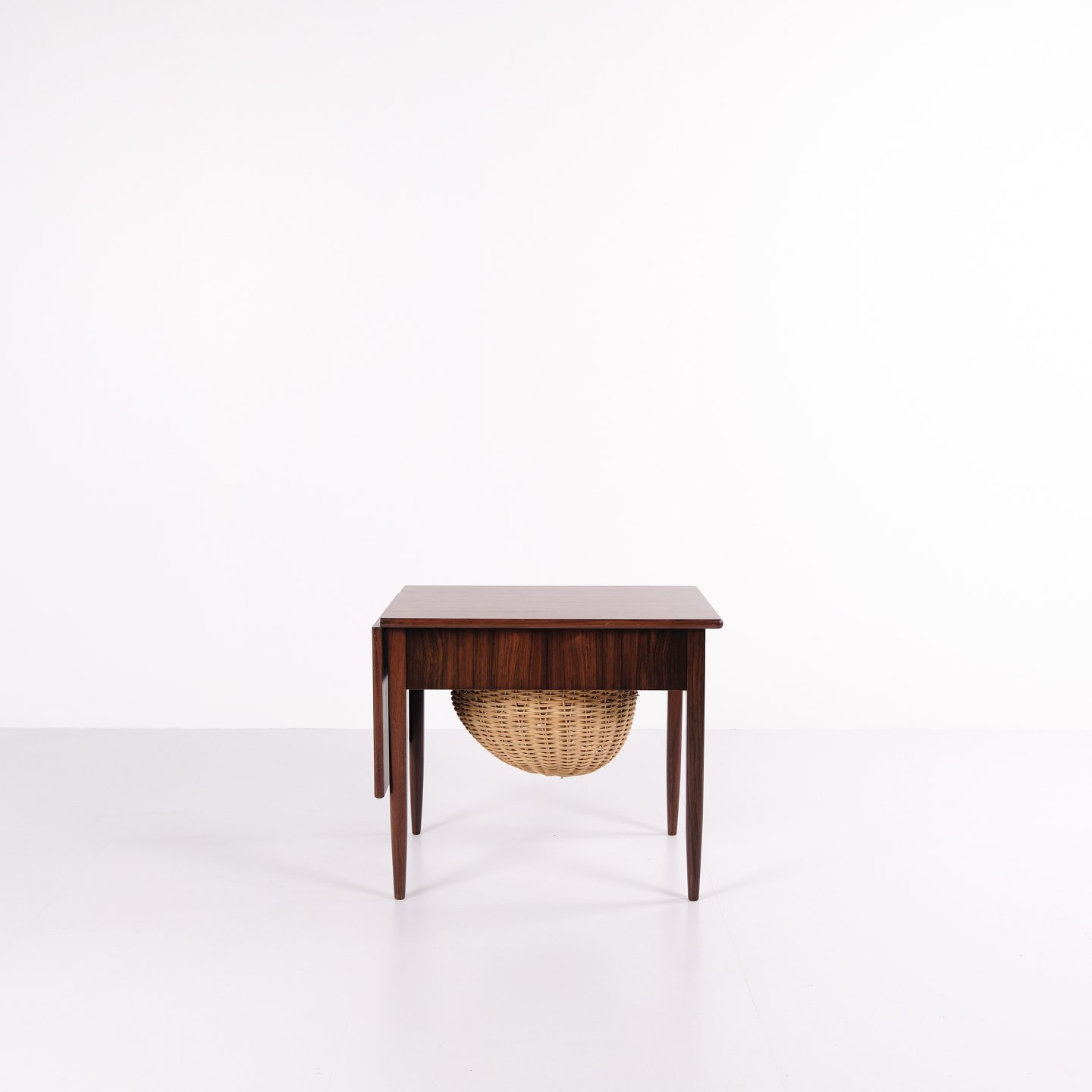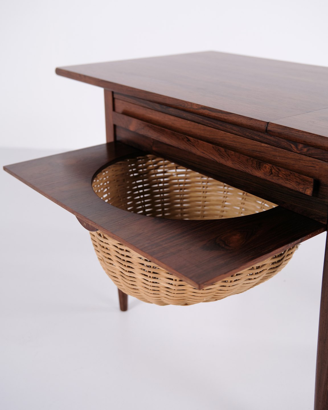 Foldbart sybord designet af Johannes Andersen og fremstillet af Silkeborg Møbelfabrik i 1960’erne. Bordet er udført i palisander og har både skuffe og udklappelig bordplade, hvilket gør det særligt funktionelt til opbevaring og arbejde.