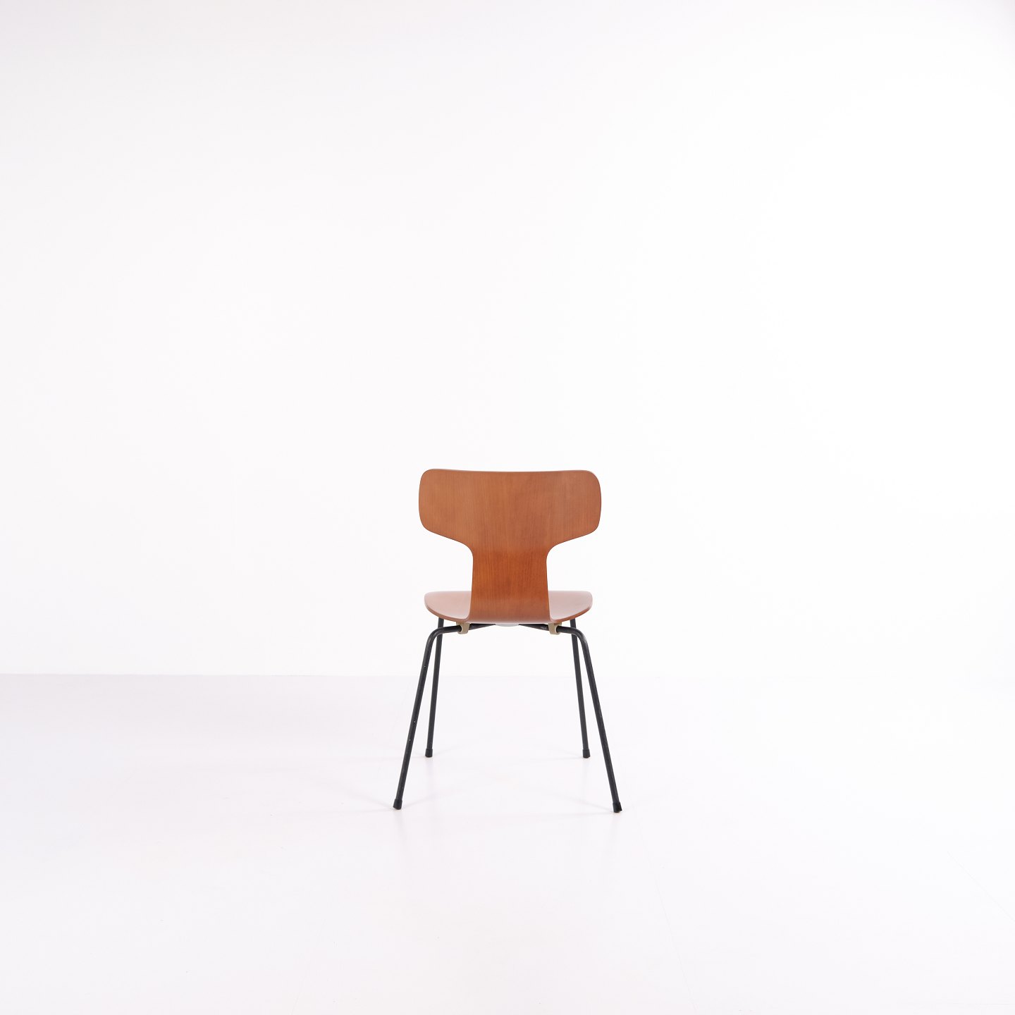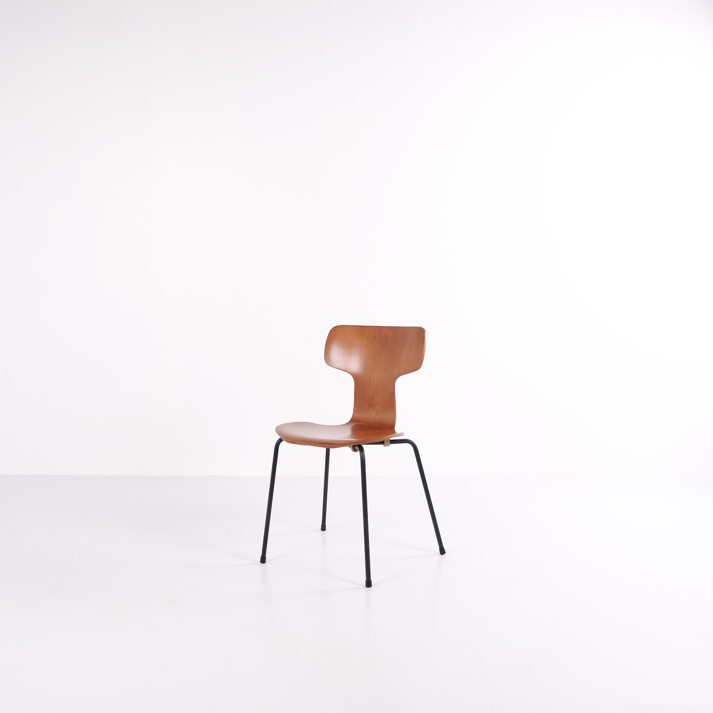 Sæt af seks spisestuestole, model 3103, også kaldet T-stolen eller Hammerstolen, fra Fritz Hansen. Stolene er professionelt behandlet og restaureret på vores værksted og fremstår i flot stand. Udstyret med originale Fritz Hansen- og Danish Control-labels, som dokumenterer ægthed og produktion.