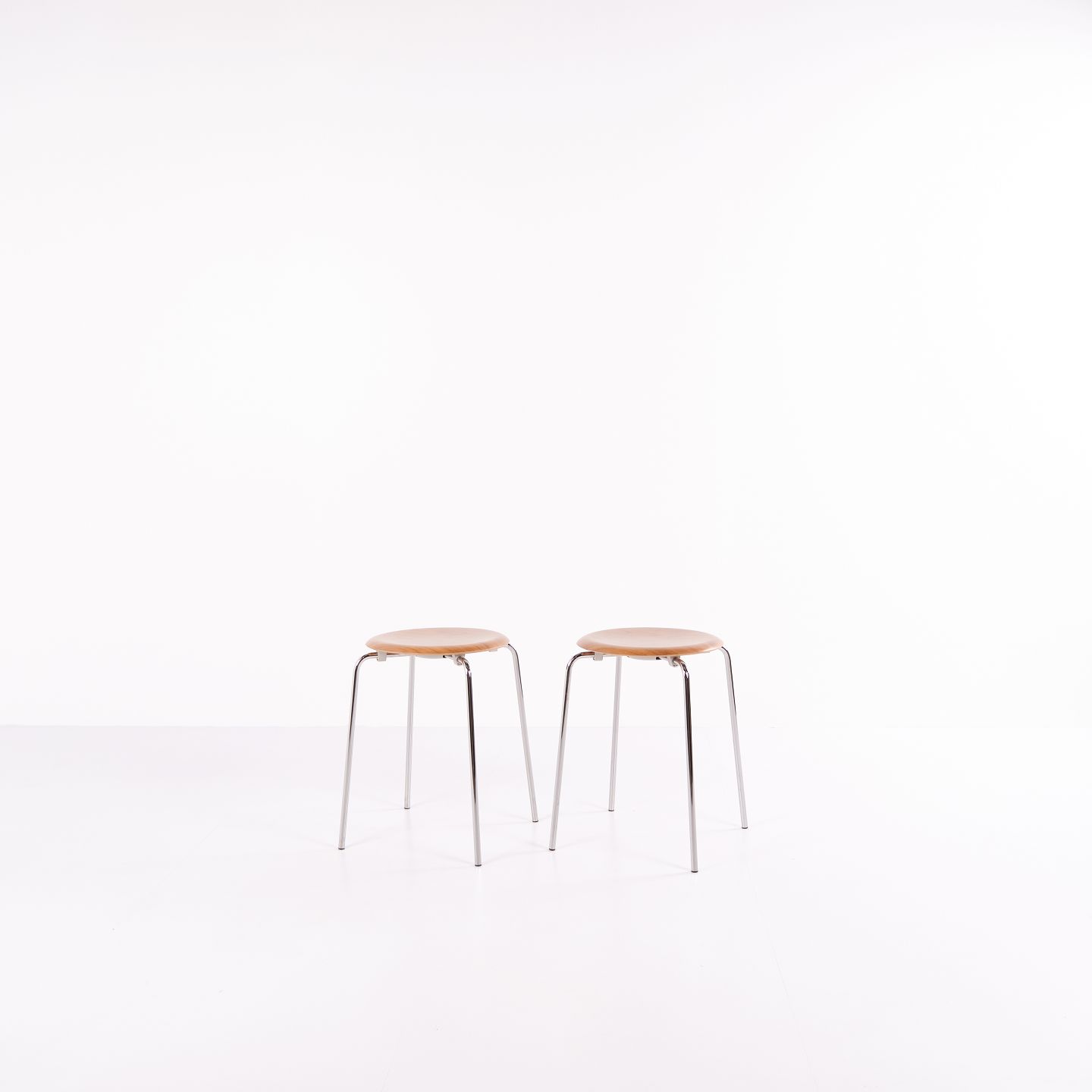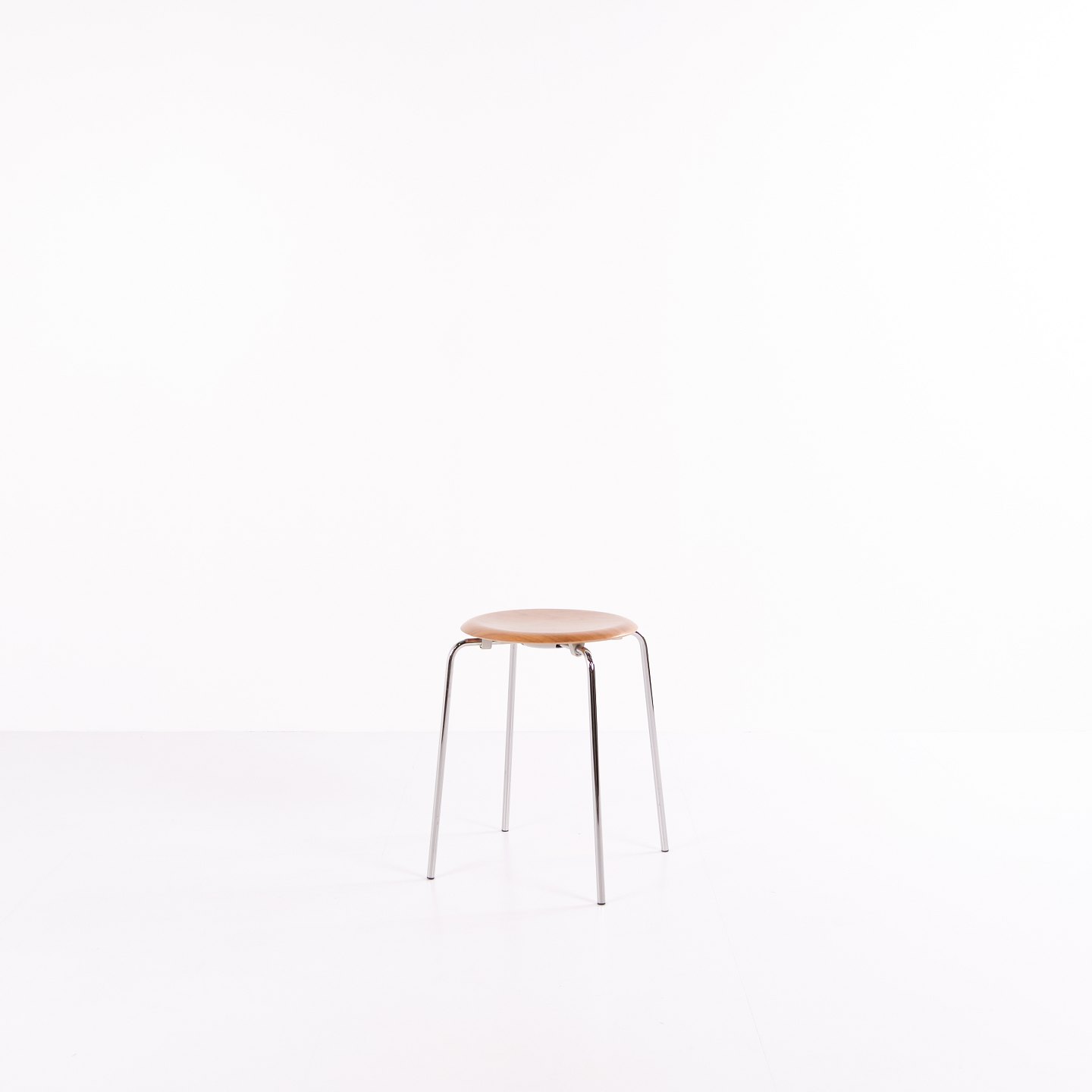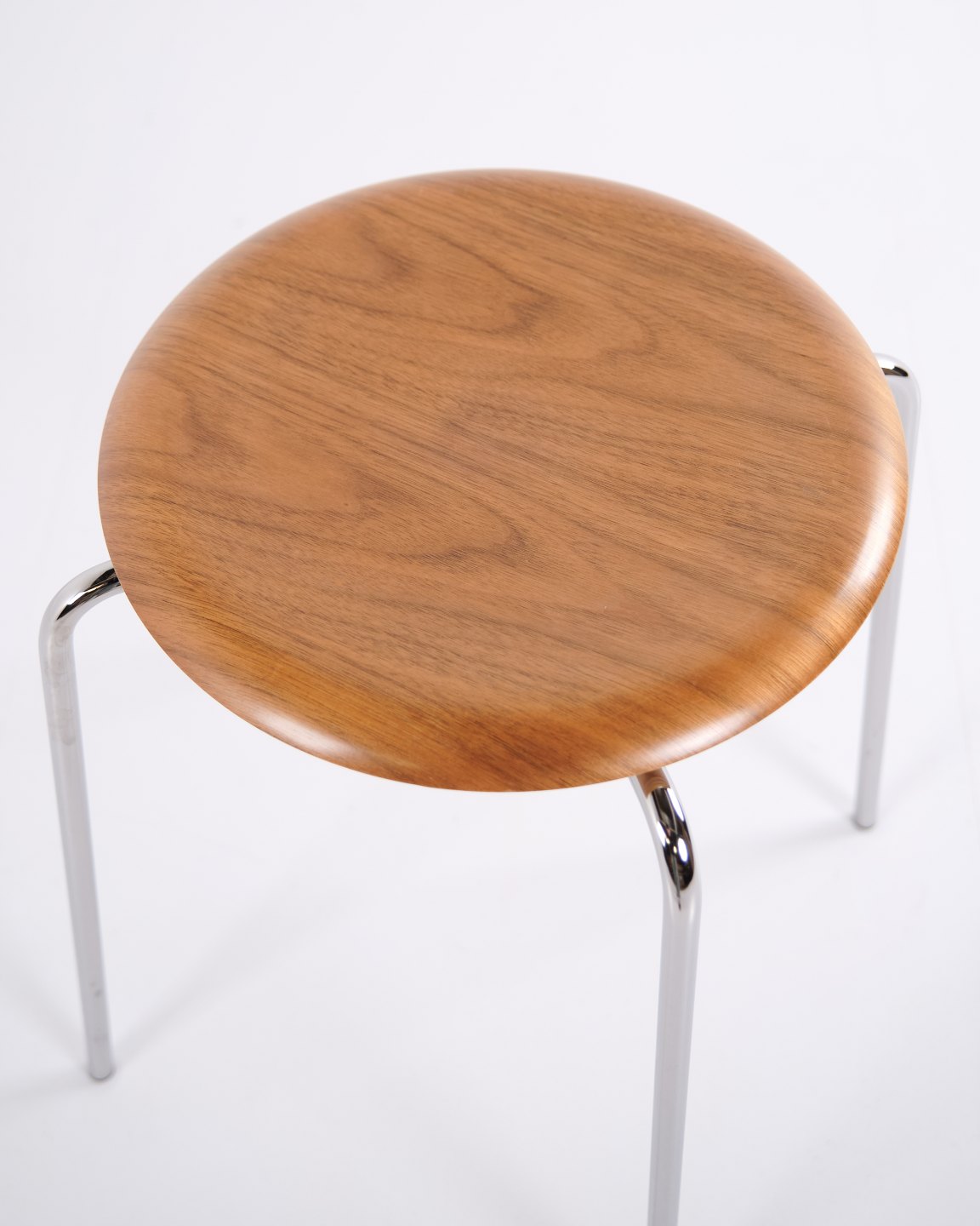 Dot taburet designet af Arne Jacobsen, udført i valnøddefiner med stel i forkromet stål. En klassisk og let taburet, der fungerer både som ekstra siddeplads og som dekorativt designobjekt i hjemmet.