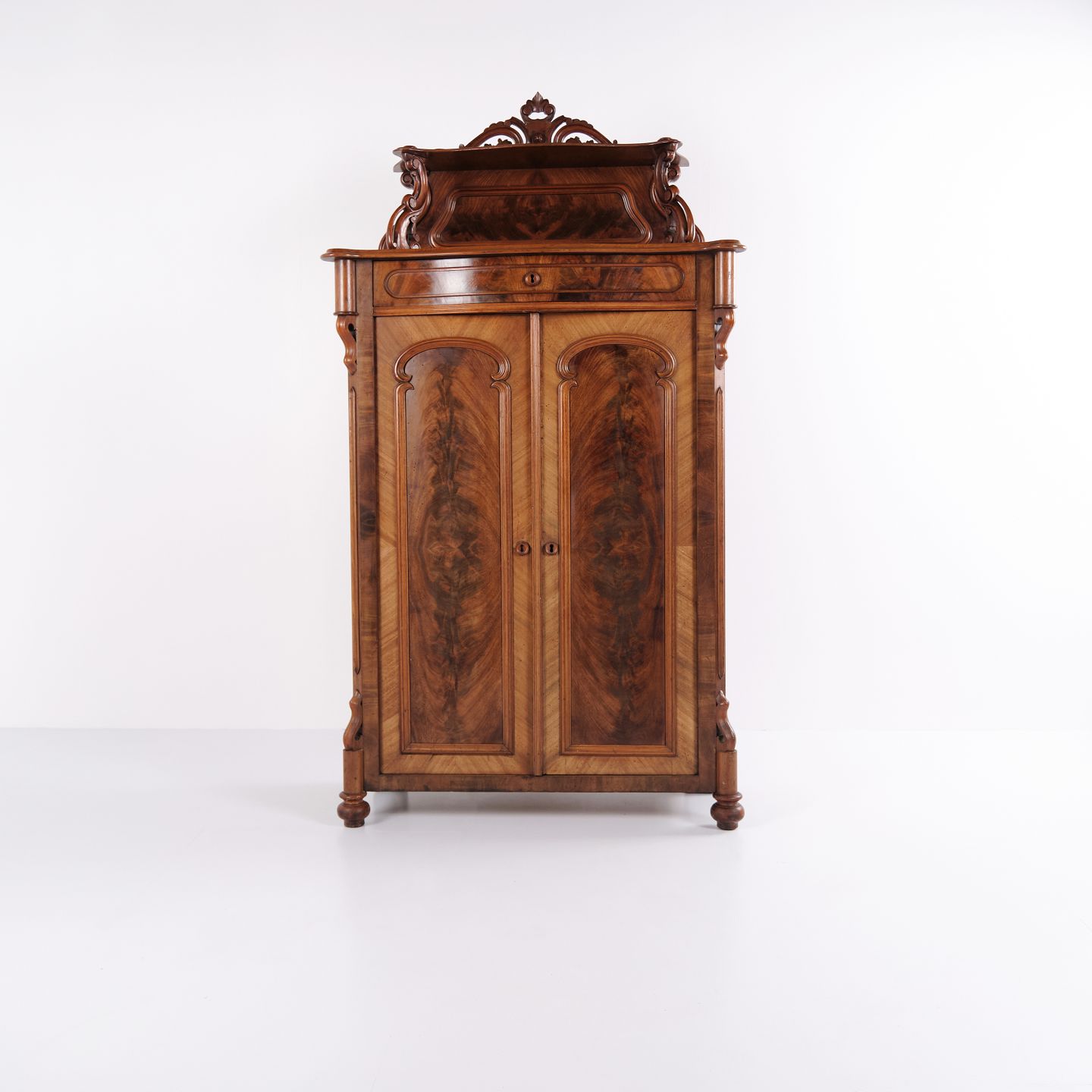 Antikt skab fra 1880’erne, udført i mahogni med dekorative udskæringer. Skabet har låger og indvendige hylder, velegnet til opbevaring i stue, entré eller spisestue.