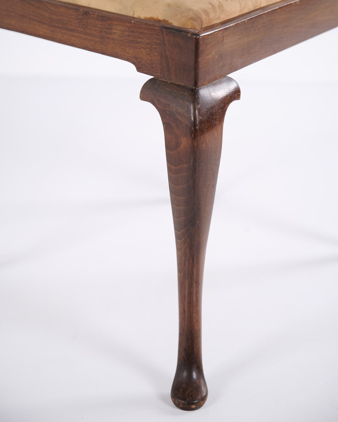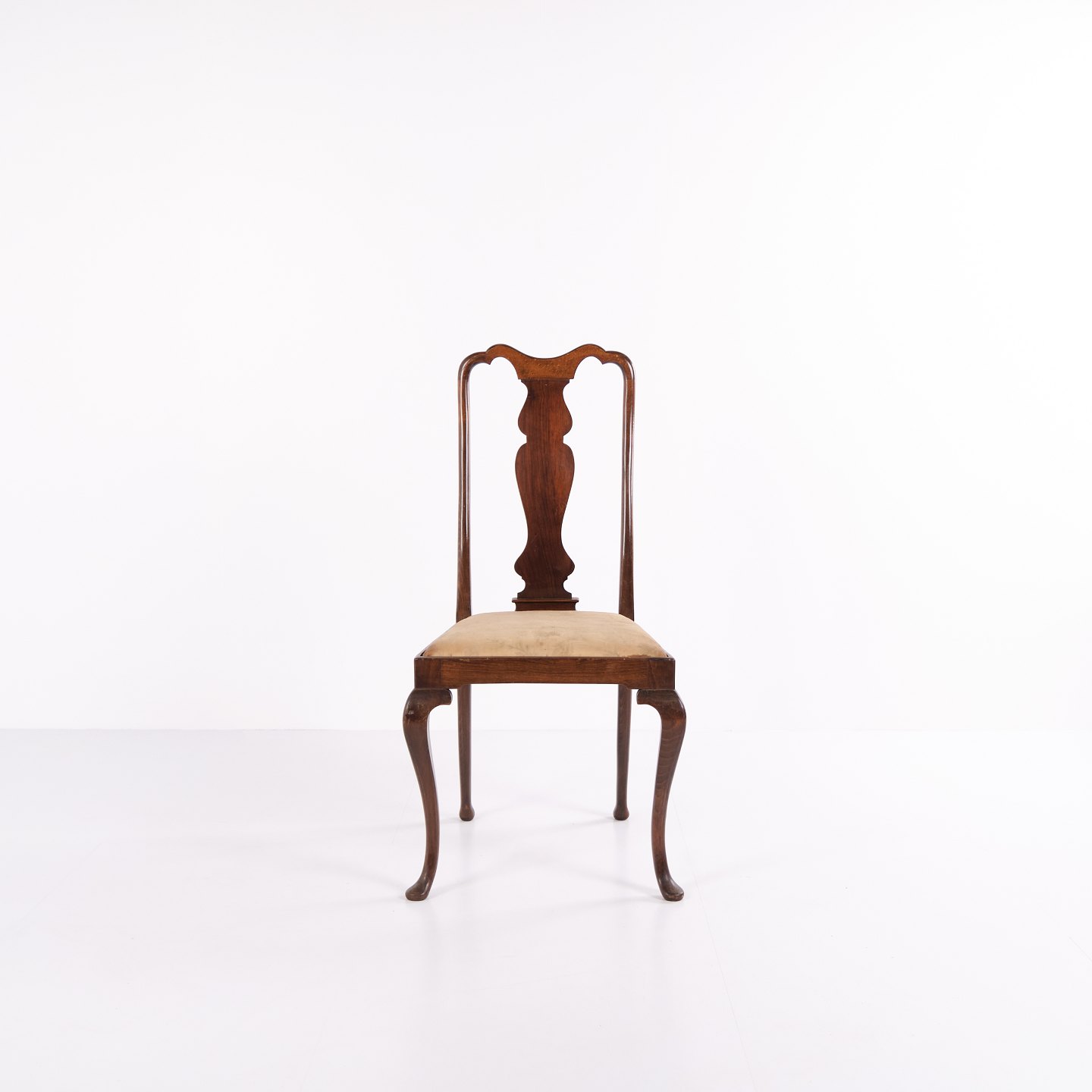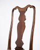 Sæt af tre spisebordsstole i Louis XV stil fra 1900-tallet, udført i mahogni med udskårne detaljer og polstret med blomstret stof. Klassiske og dekorative stole, velegnede til spiseområde eller stue. Solidt håndværk med tidstypisk formsprog.