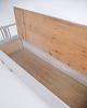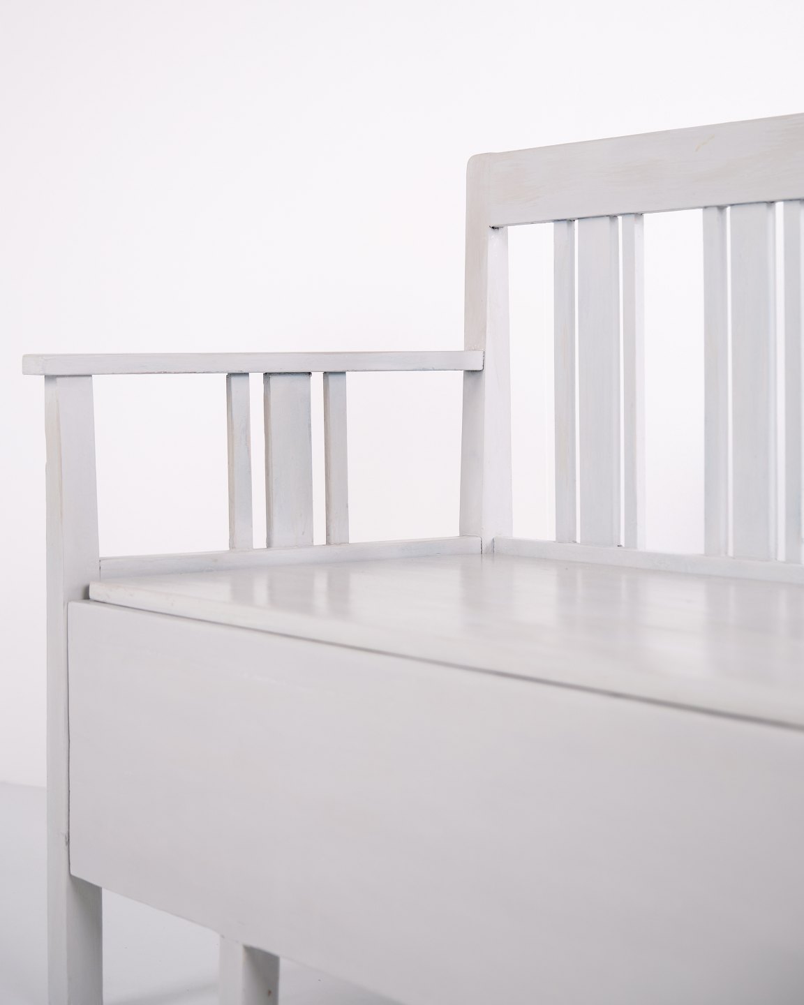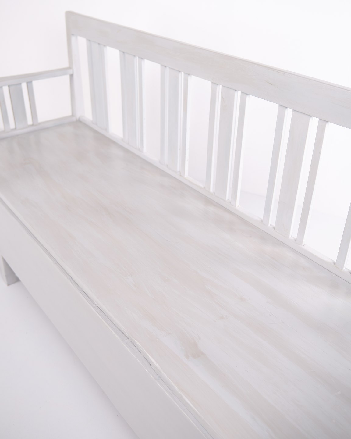 Svensk slagbænk fra ca. 1860’erne, udført i fyrretræ og gråmalet i senere tid. Klassisk skandinavisk møbel med dekorative bemalinger og praktisk sidde- og opbevaringsfunktion. Et solidt antikt stykke med tidstypiske detaljer.