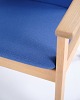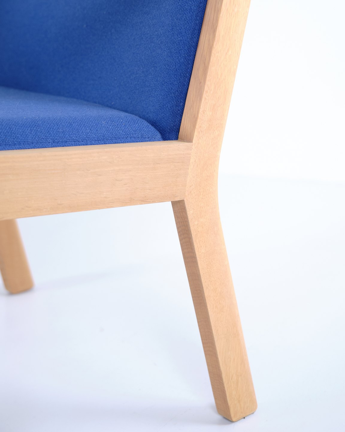 Lænestol model GE 284 designet af Hans J. Wegner og fremstillet af Getama. Udført med stel i massivt egetræ og løse hynder betrukket med blå uld. Klassisk Wegner-design med god siddekomfort og en kompakt form, der passer i både moderne og traditionelle indretninger.