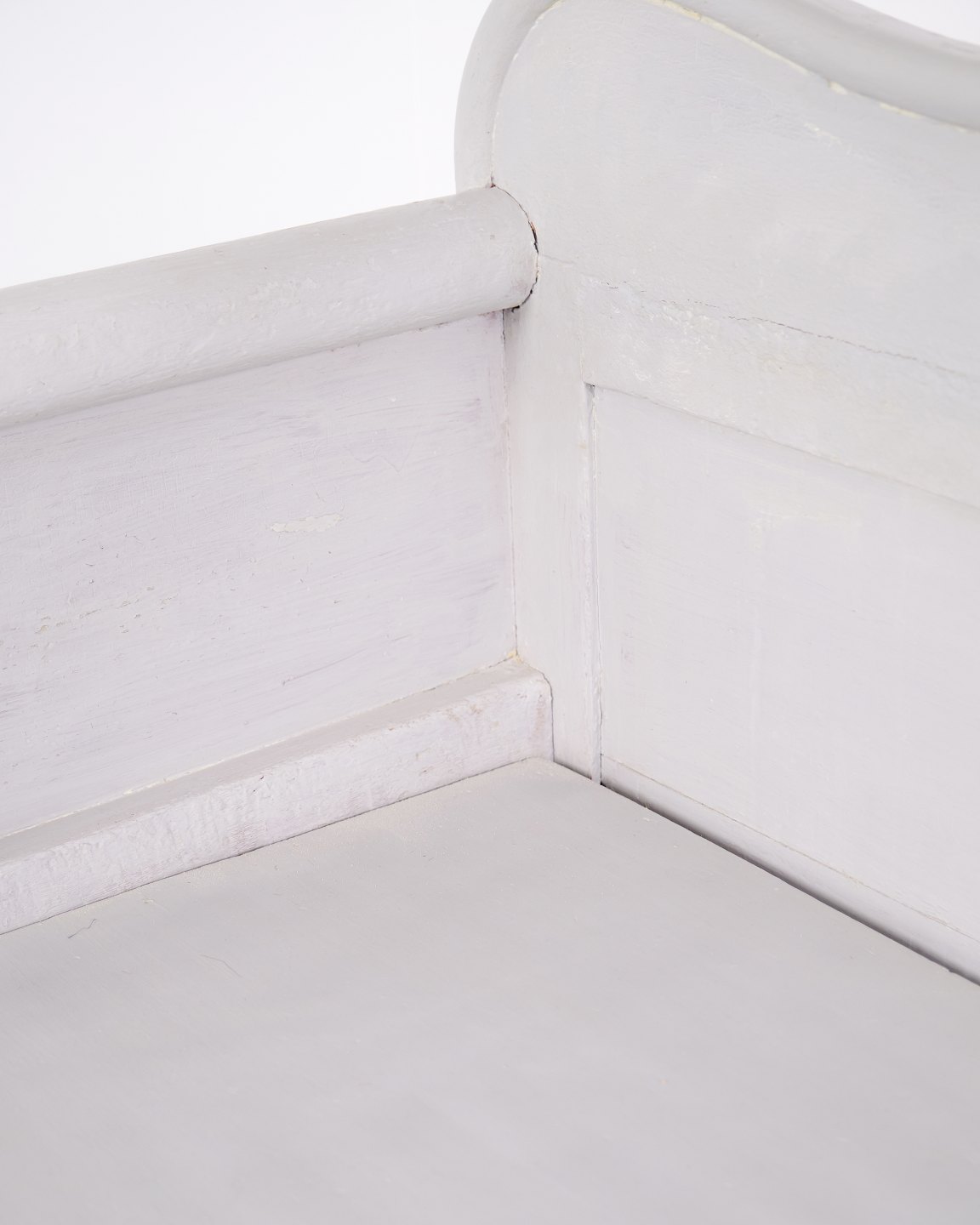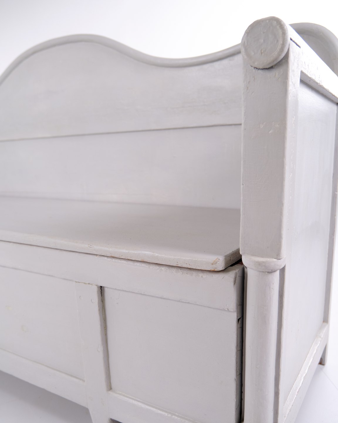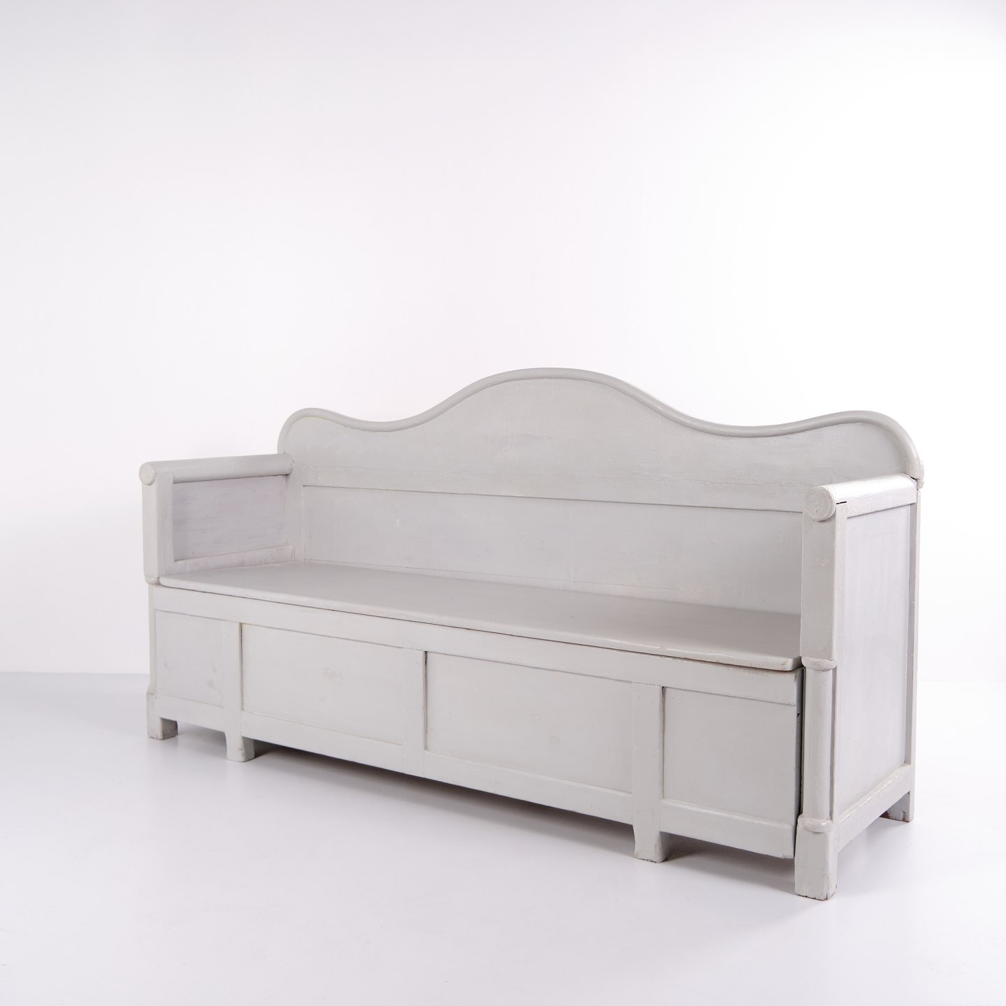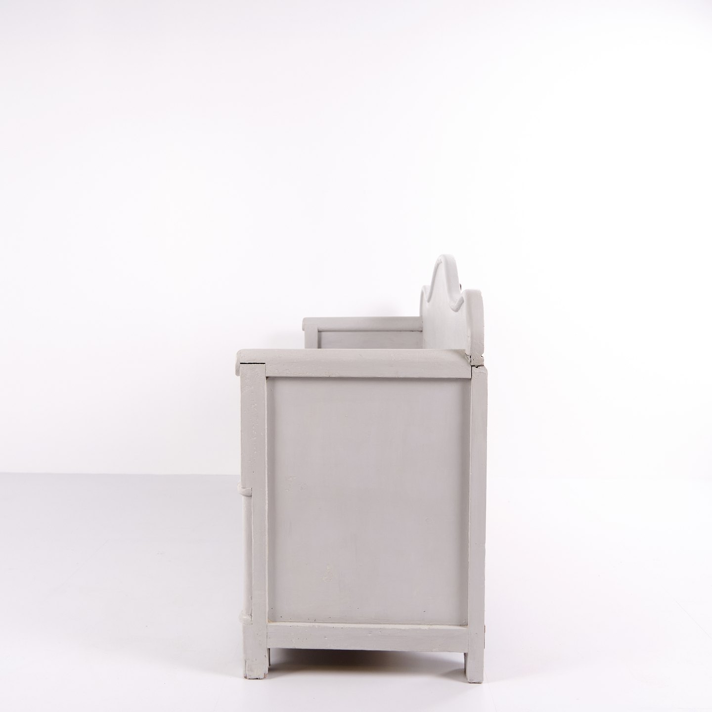 Antik svensk slagbænk fra 1900-tallet, udført i fyrretræ og grå bemalet. Klassisk model med opbevaringsrum under sædet og tidstypiske skandinaviske detaljer. Solidt møbel, velegnet til entré, køkken eller stue.