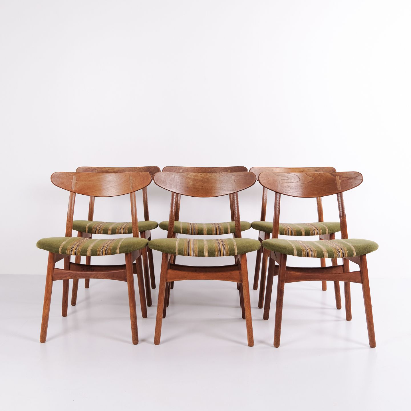 Sæt af seks spisebordsstole, model CH30, designet af Hans J. Wegner i 1954 og produceret i 1950’erne. Stolene er udført i teak og eg med originalt brændemærke. En klassisk Wegner-model med god siddekomfort og velkendt håndværk fra perioden.