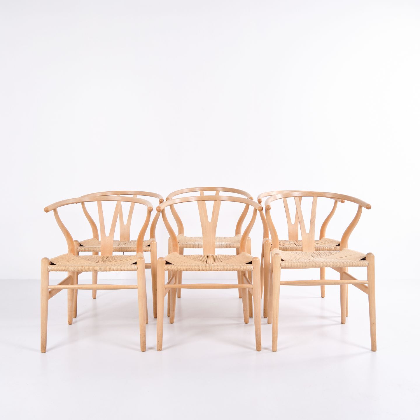 Sæt af seks CH24 Y-stole af Hans J. Wegner for Carl Hansen & Søn. Bøg og naturflet. Dansk design fra 1970’erne.