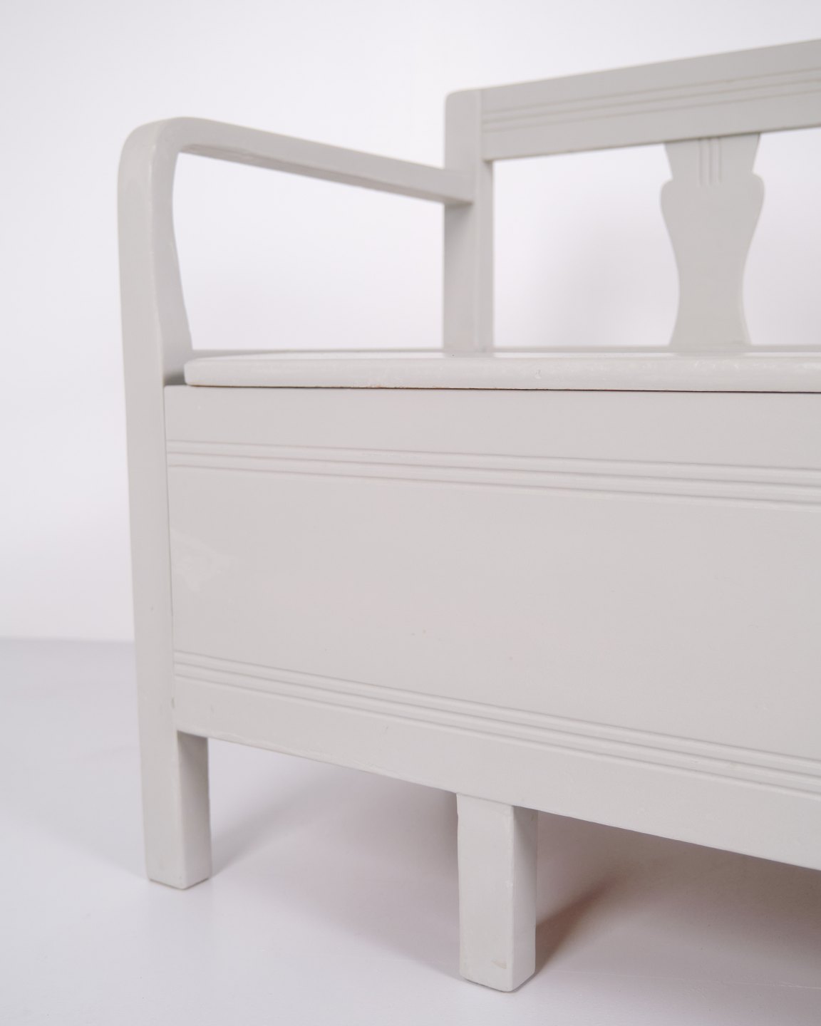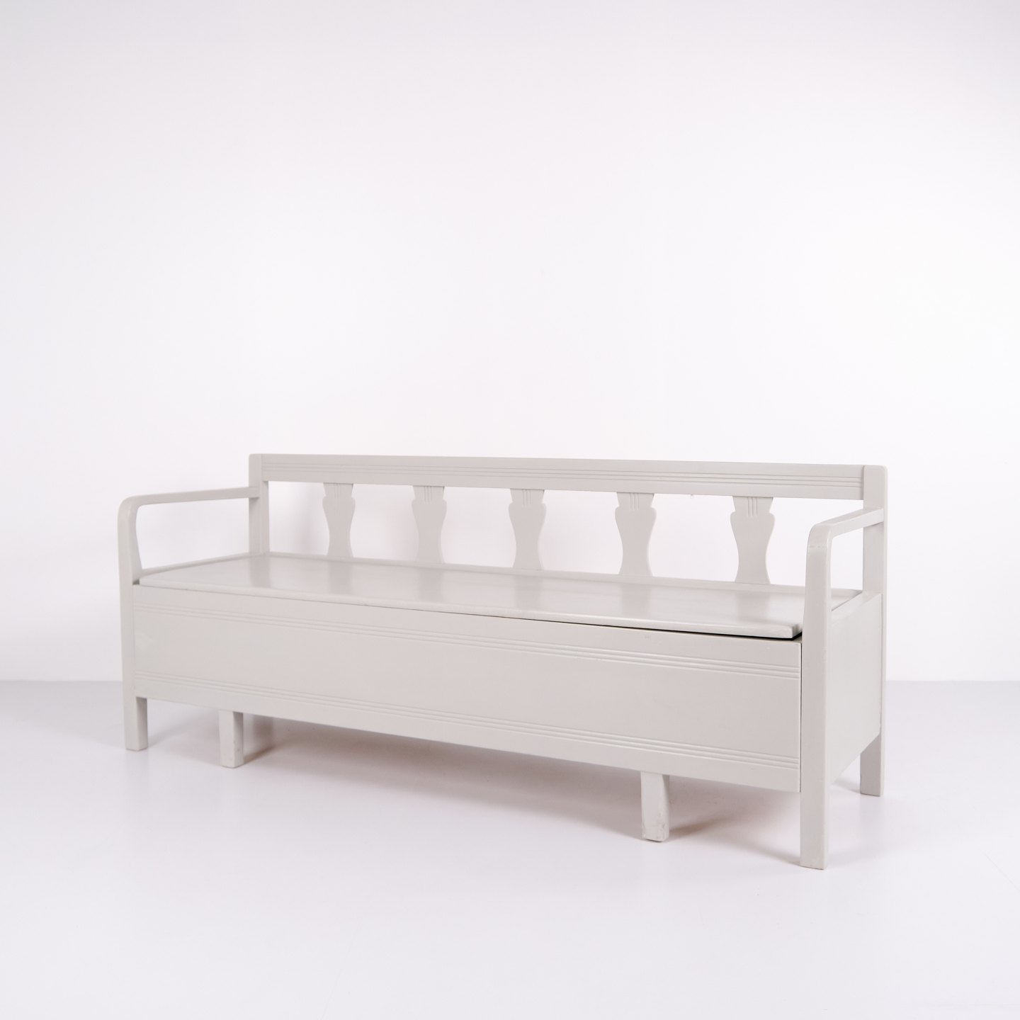 Antik slagbænk fra 1860’erne i gråmalet fyrretræ. Klassisk almuedesign med siddeplads og opbevaring. Historisk og funktionelt møbel.