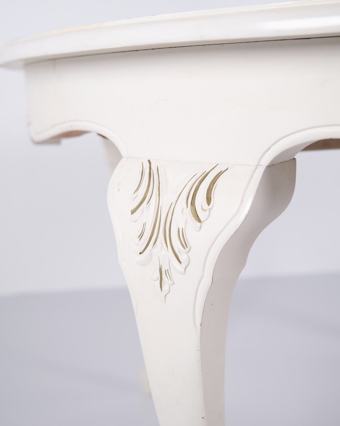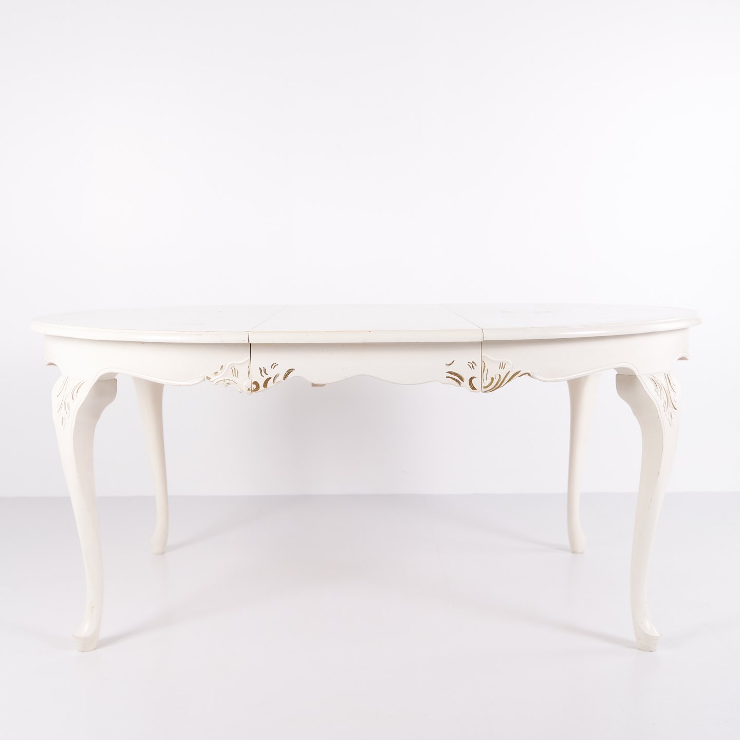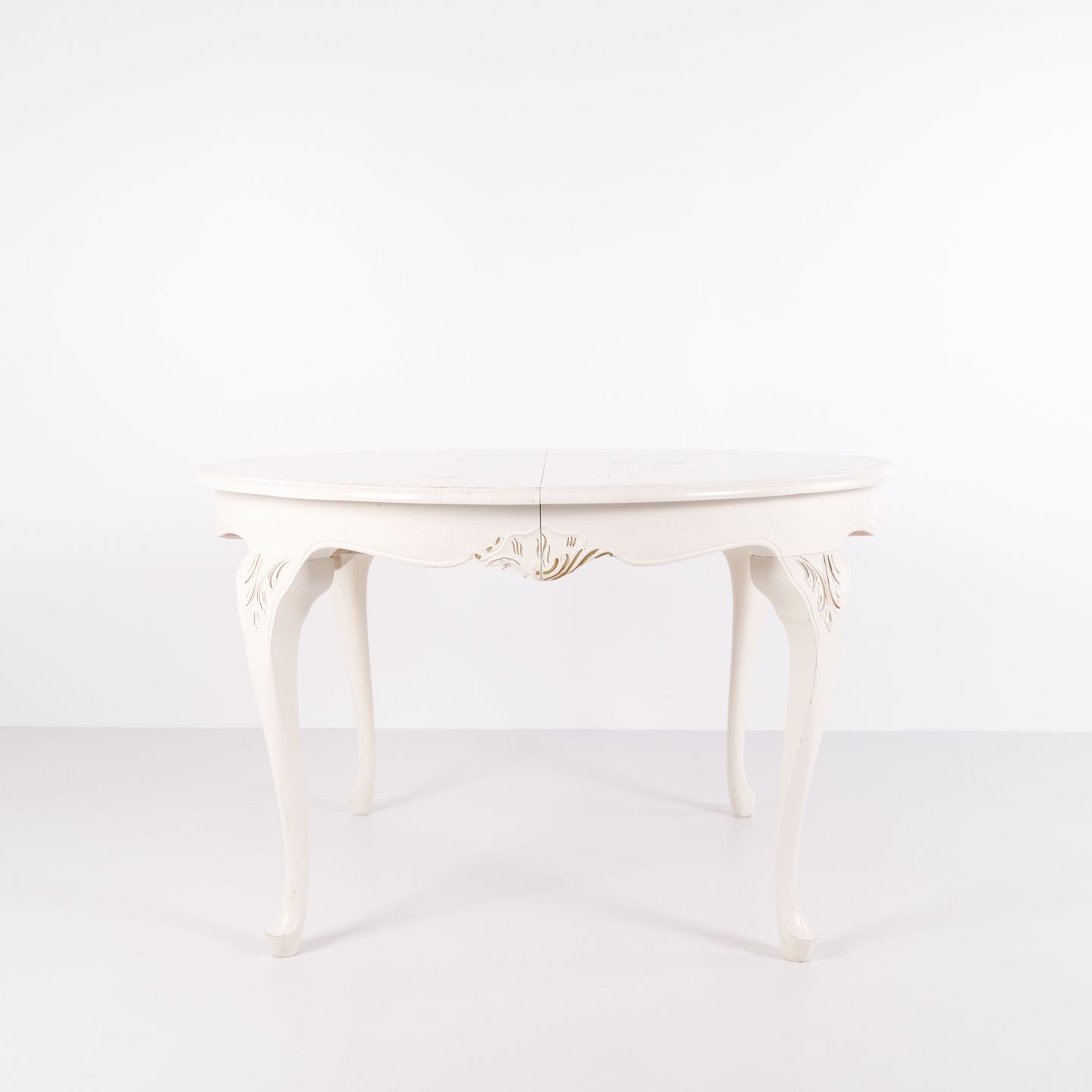Antikt rundt spisebord i ny rokoko stil fra 1920’erne. Hvidmalet med dekorative detaljer og 4 tillægsplader.