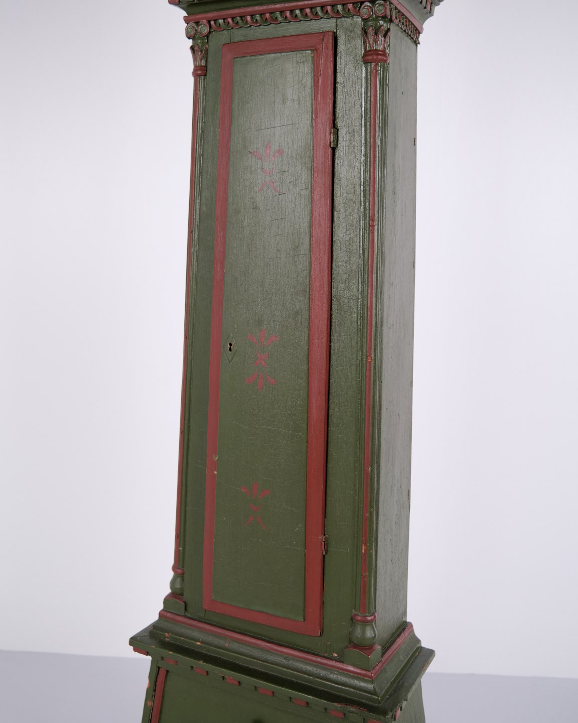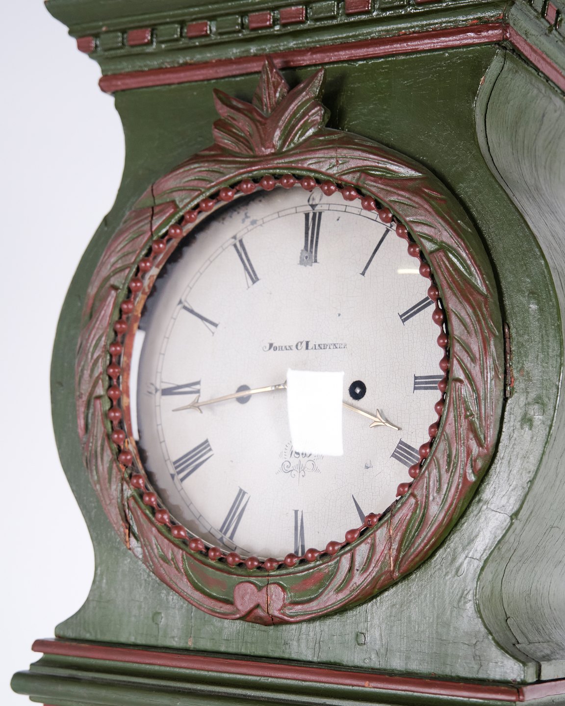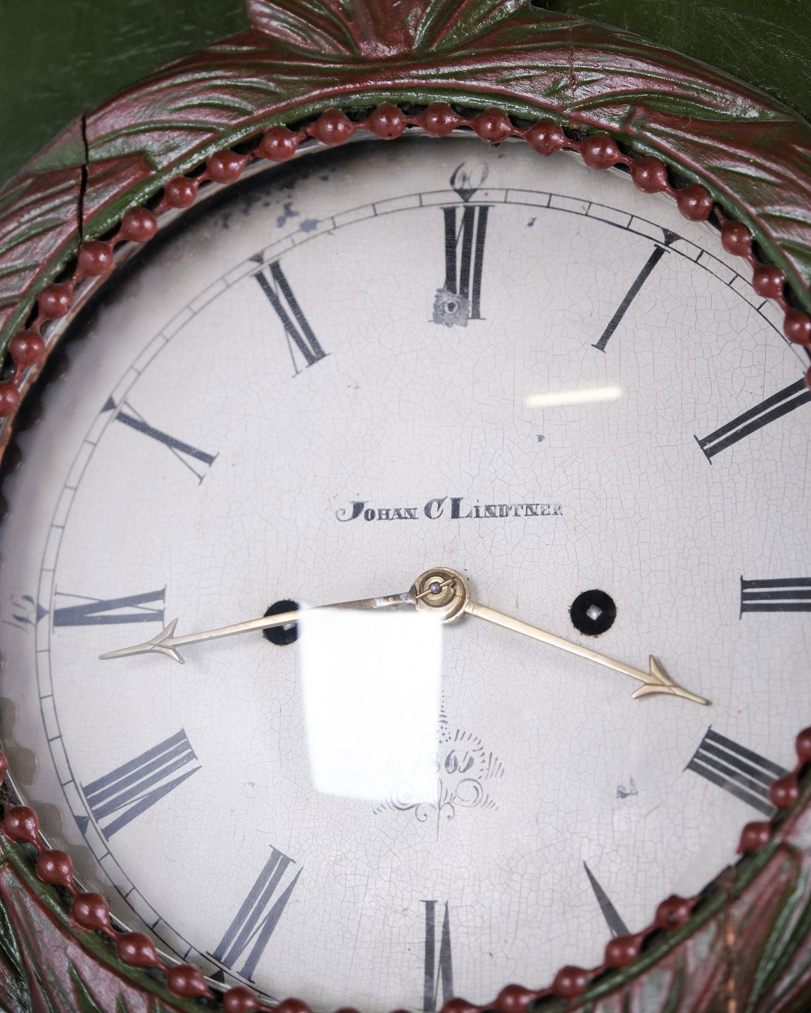 Bornholmerur frøkenmodel 1860’erne, håndmalet med udskårne detaljer i grøn/rød bemaling. Antikt bornholmer ur 1800-tallet.