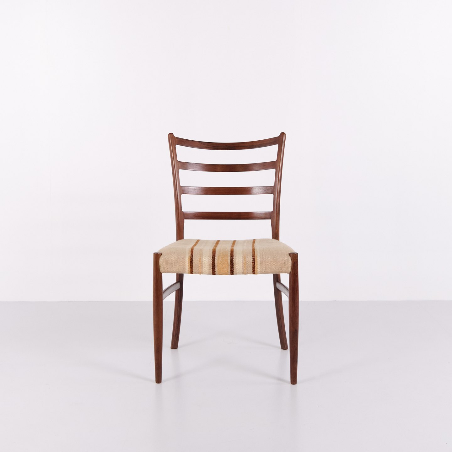 N.O. Møller spisebordsstole i palisander med stribet polster fra 1960’erne. Design af J.L. Møllers Møbelfabrik.