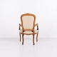 Nyrokoko armstol fra 1930’erne med buede ben og mønstret blomstret stof. Klassisk og dekorativt møbel i elegant stil.