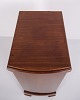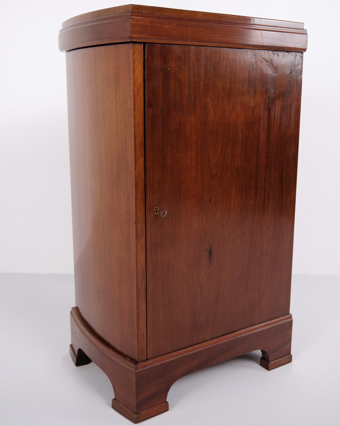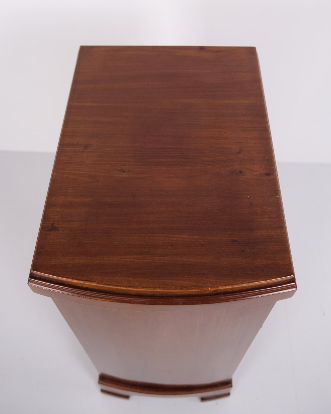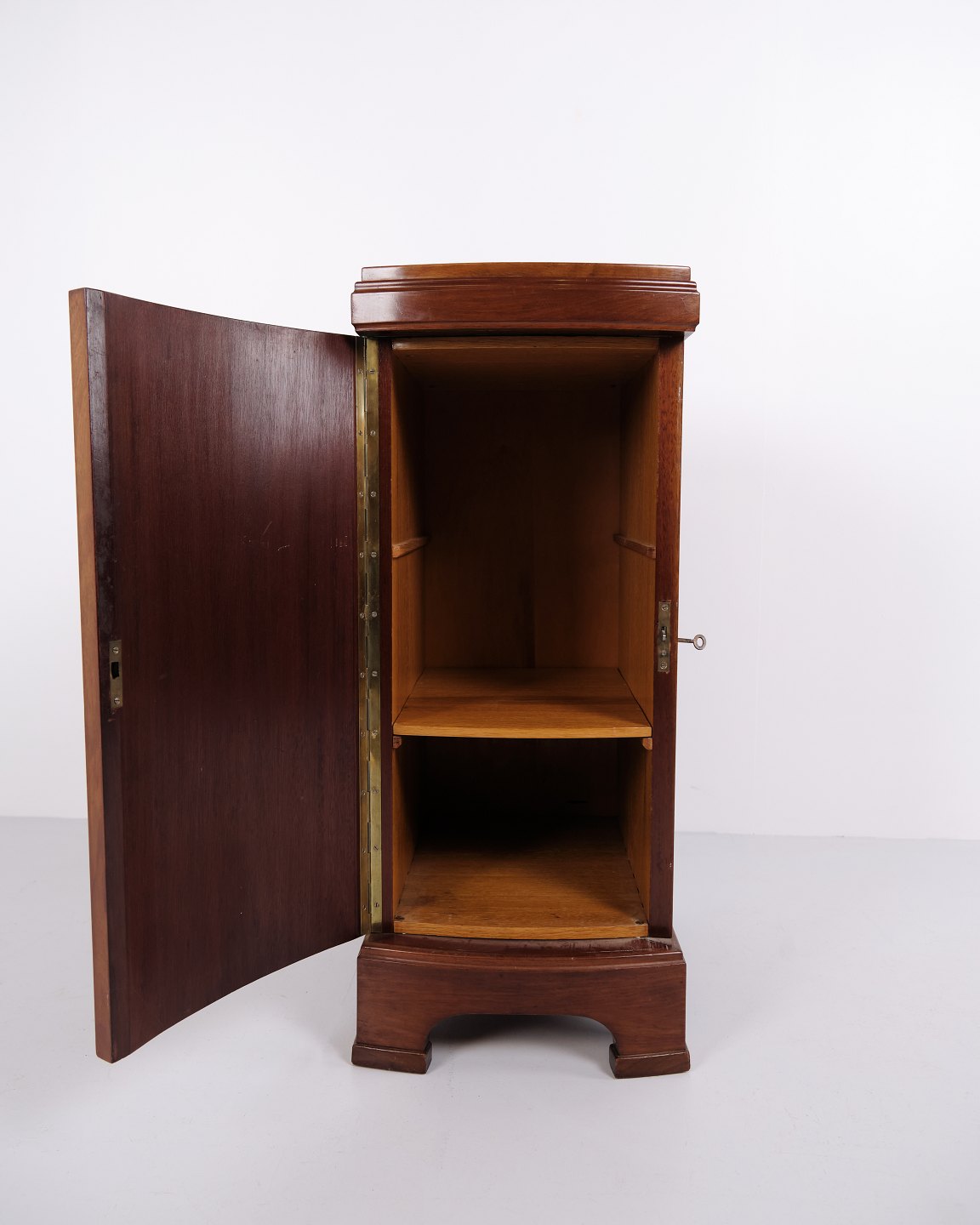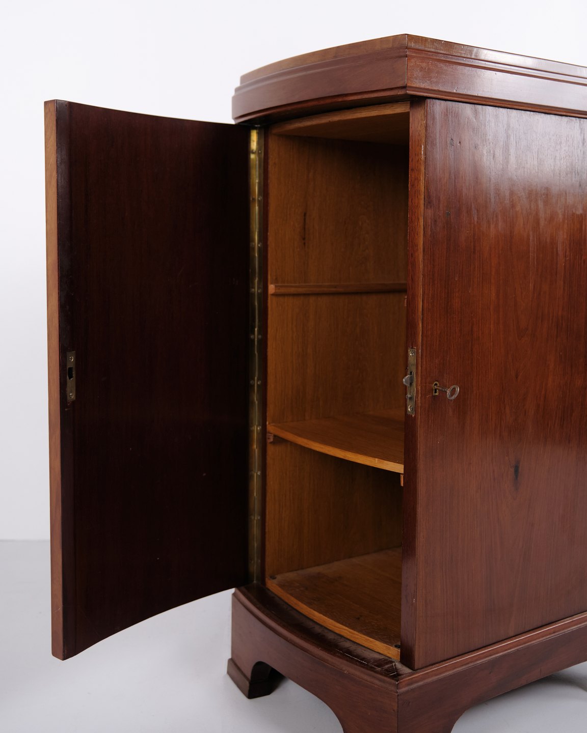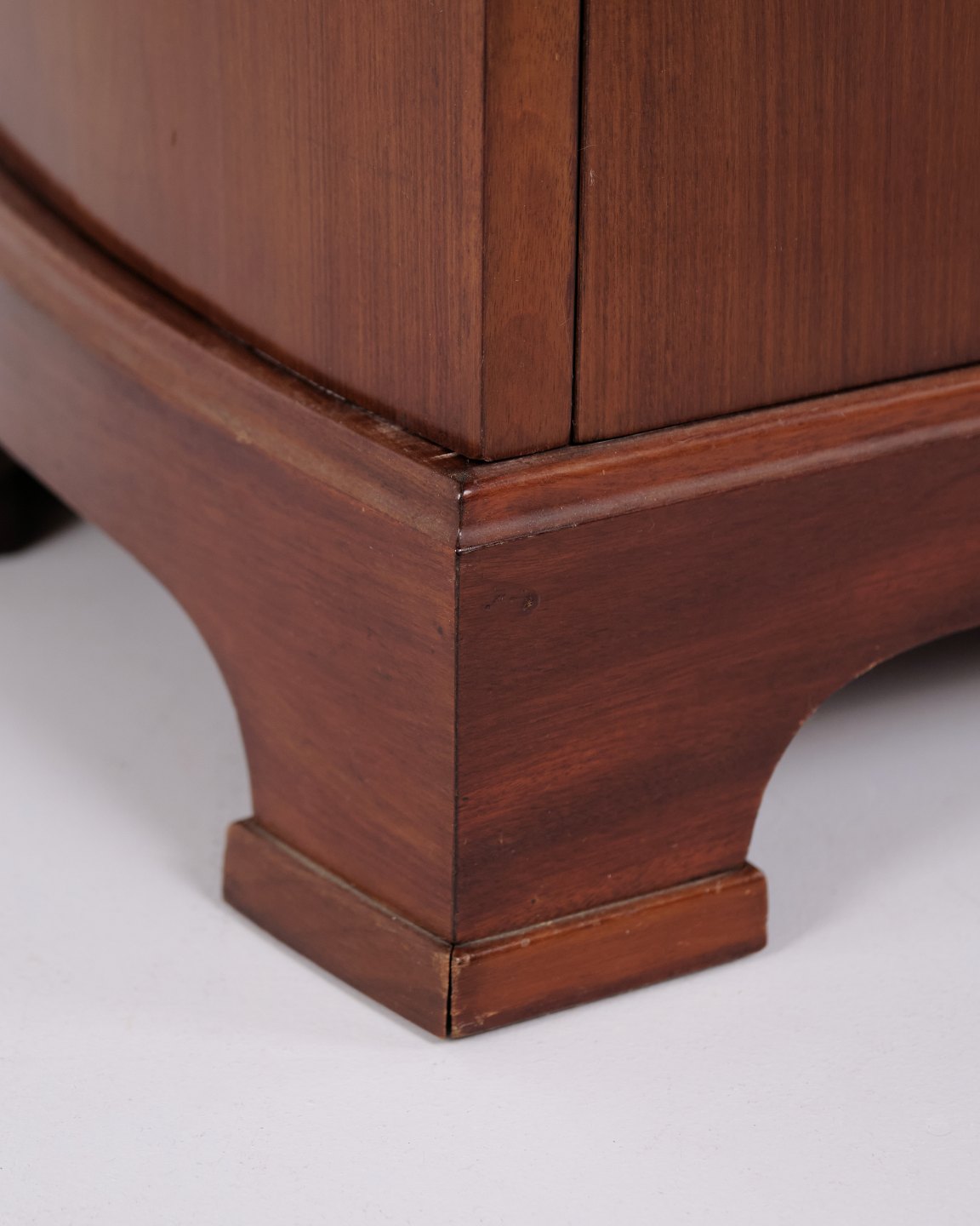 Et Par natborde i mahogni fra 1920’erne med buet front og håndpoleret overflade. Klassisk design med elegant udtryk.