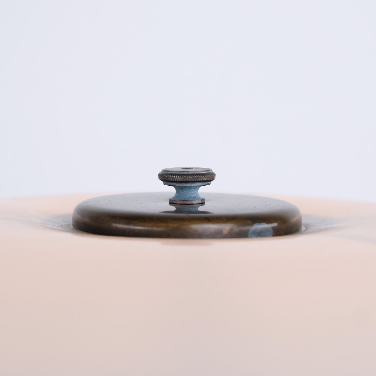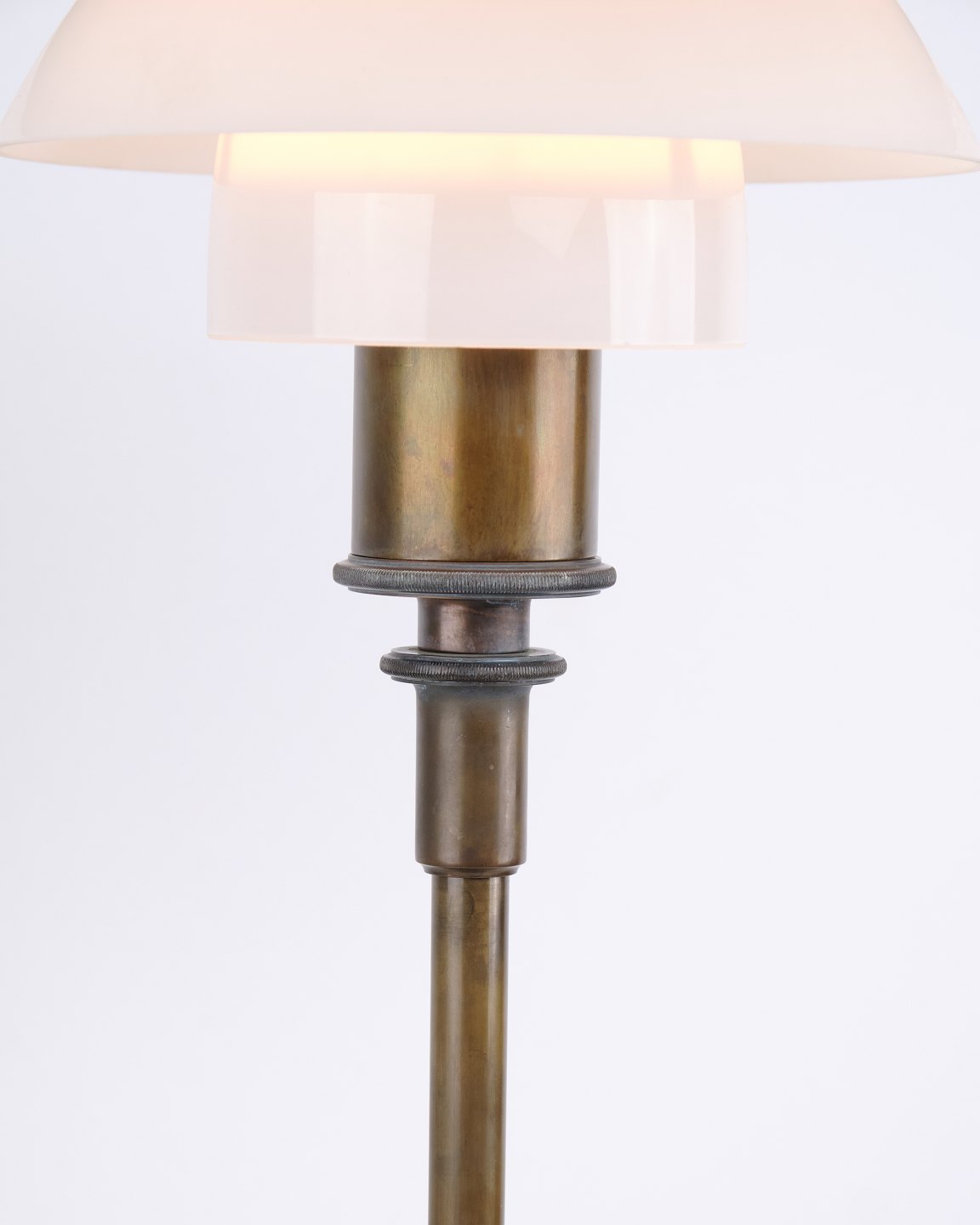 PH 4/3 bordlampe designet af Poul Henningsen og produceret af Louis Poulsen i 1930’erne. Lampen er udført i bruneret messing med skærme i hvidt opalglas, som giver en behagelig og diffust fordelt belysning.