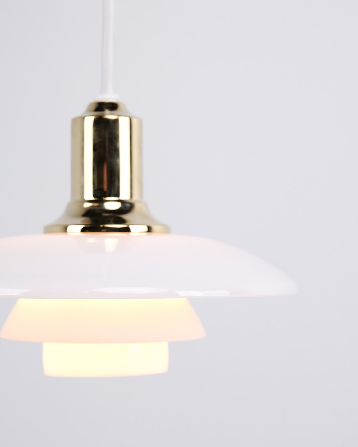 PH 2/1 pendel i messing med opalglas fra Louis Poulsen. Designet af Poul Henningsen med klassisk dansk lysdesign og blændfri belysning.