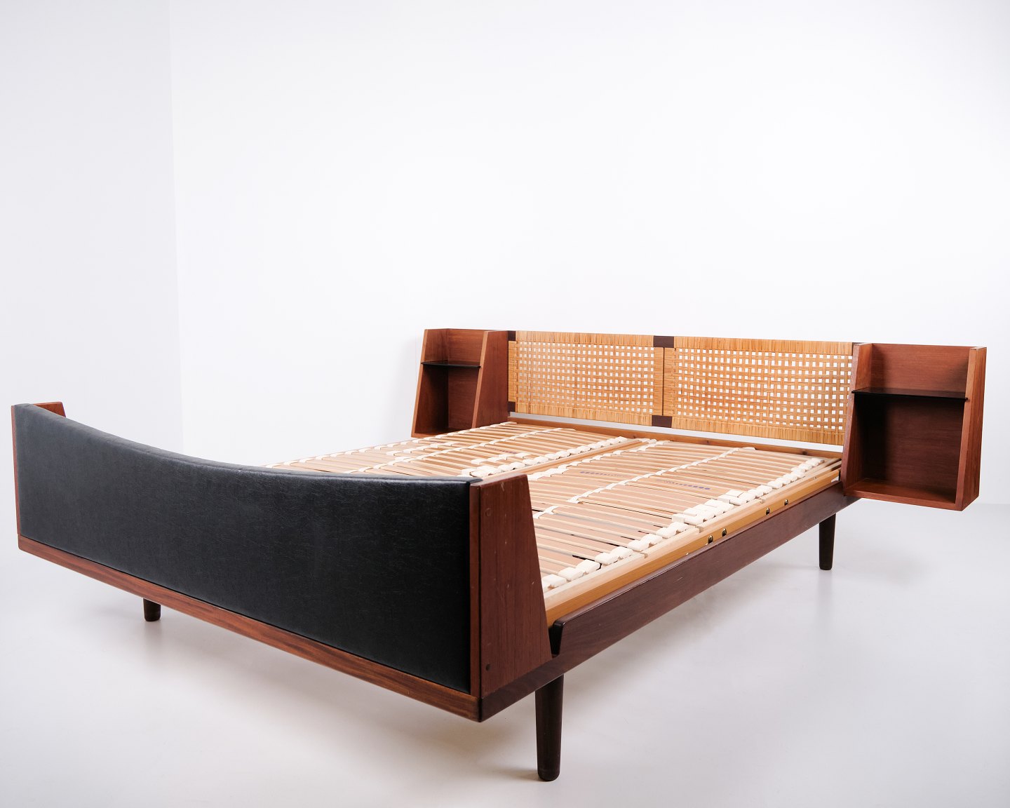 Model GE 701 dobbeltseng designet af Hans J. Wegner og fremstillet hos Getama i 1950’erne. Udført i fineret og massivt teaktræ. Gavle med sjeneflet og sort kunstlæder. Hovedgavl med integrerede sengeborde med hylder i sort glas samt underliggende hylde. Messingbeslag. Hans J. Wegner samarbejdede gennem mange år med Getama og udviklede flere møbler i teak til boligindretning og soveværelse.