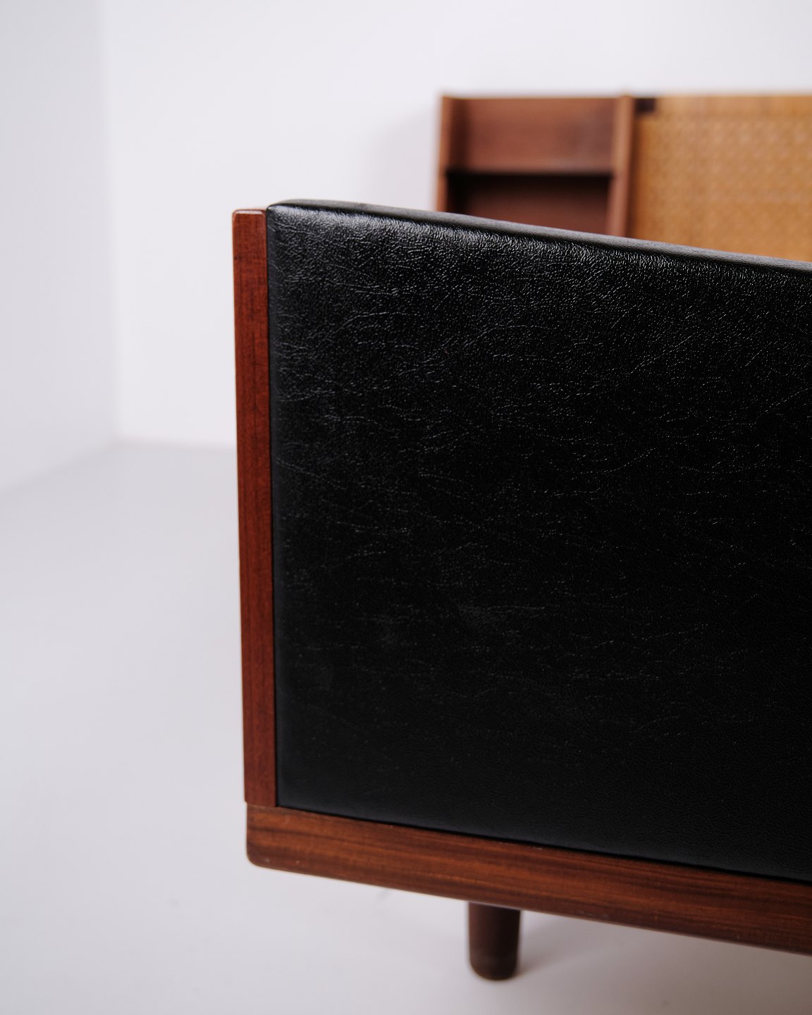 — Materiale: Fineret teak, massiv teak, sjeneflet, sort kunstlæder og messing