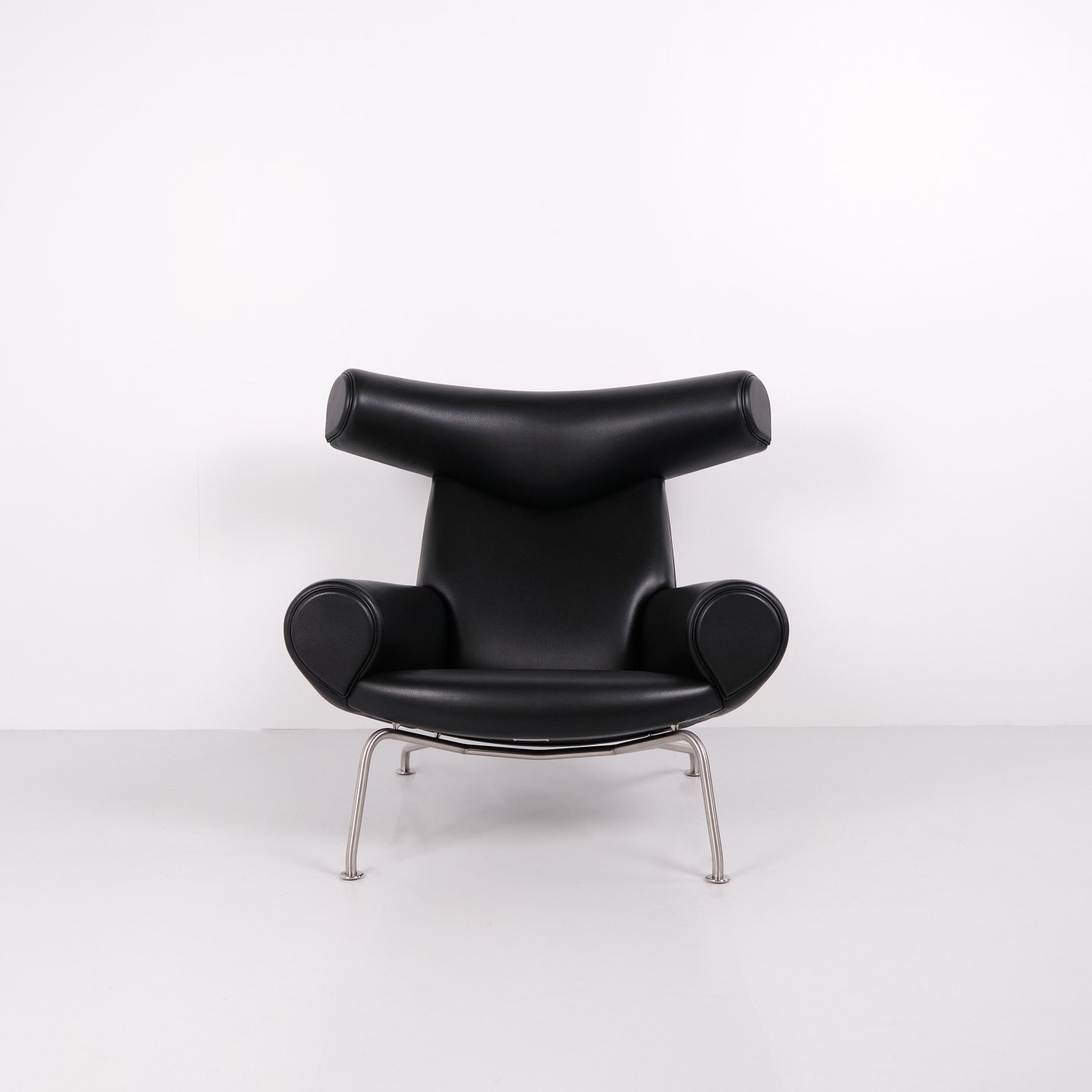 Ox Chair model EJ100 med tilhørende skammel designet af Hans J. Wegner. Modellen blev tegnet i 1960 og produceres i dag af Fredericia Furniture efter overtagelsen af Erik Jørgensen. Stolen er udført i sort læder med stel i stål. Det markante ryglæn med “horn” gav modellen navnet Ox Chair. ´