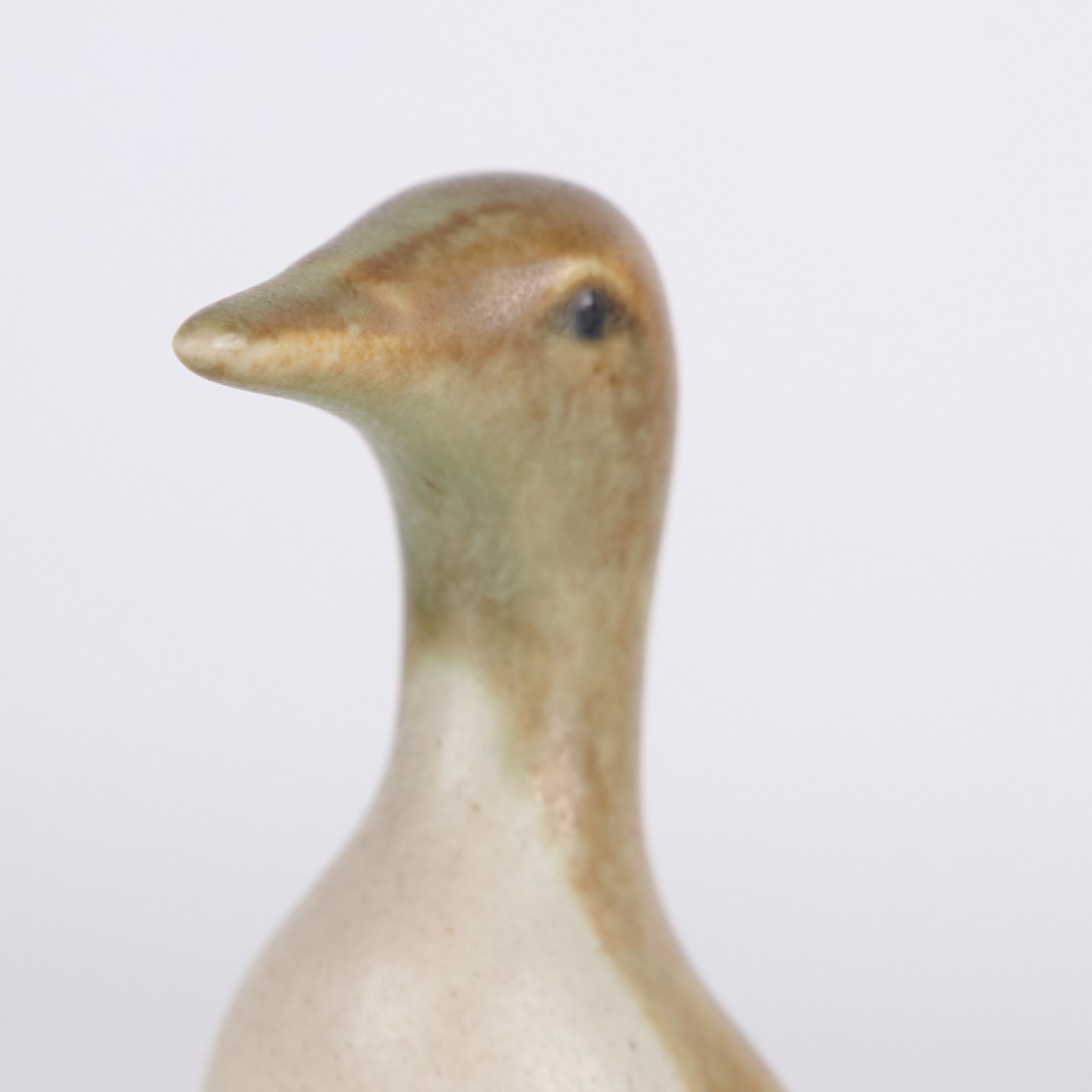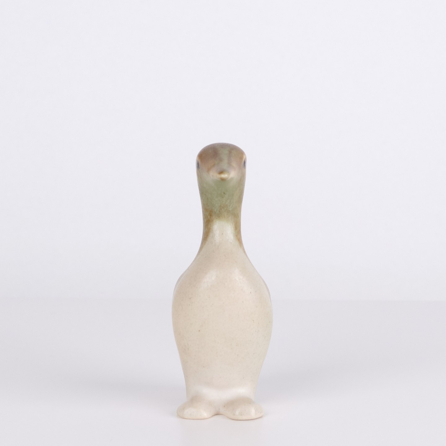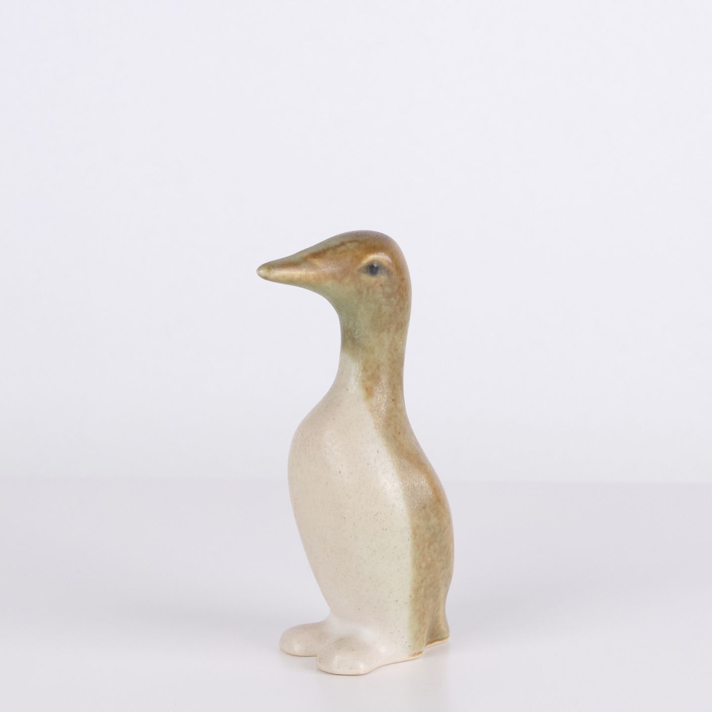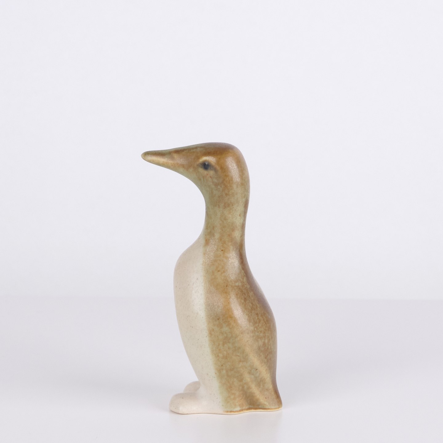 Keramisk pingvinfigur udført i glaseret stentøj fra 1960’erne. Figuren har enkel skandinavisk form med lyse glasurer og brun dekoration.