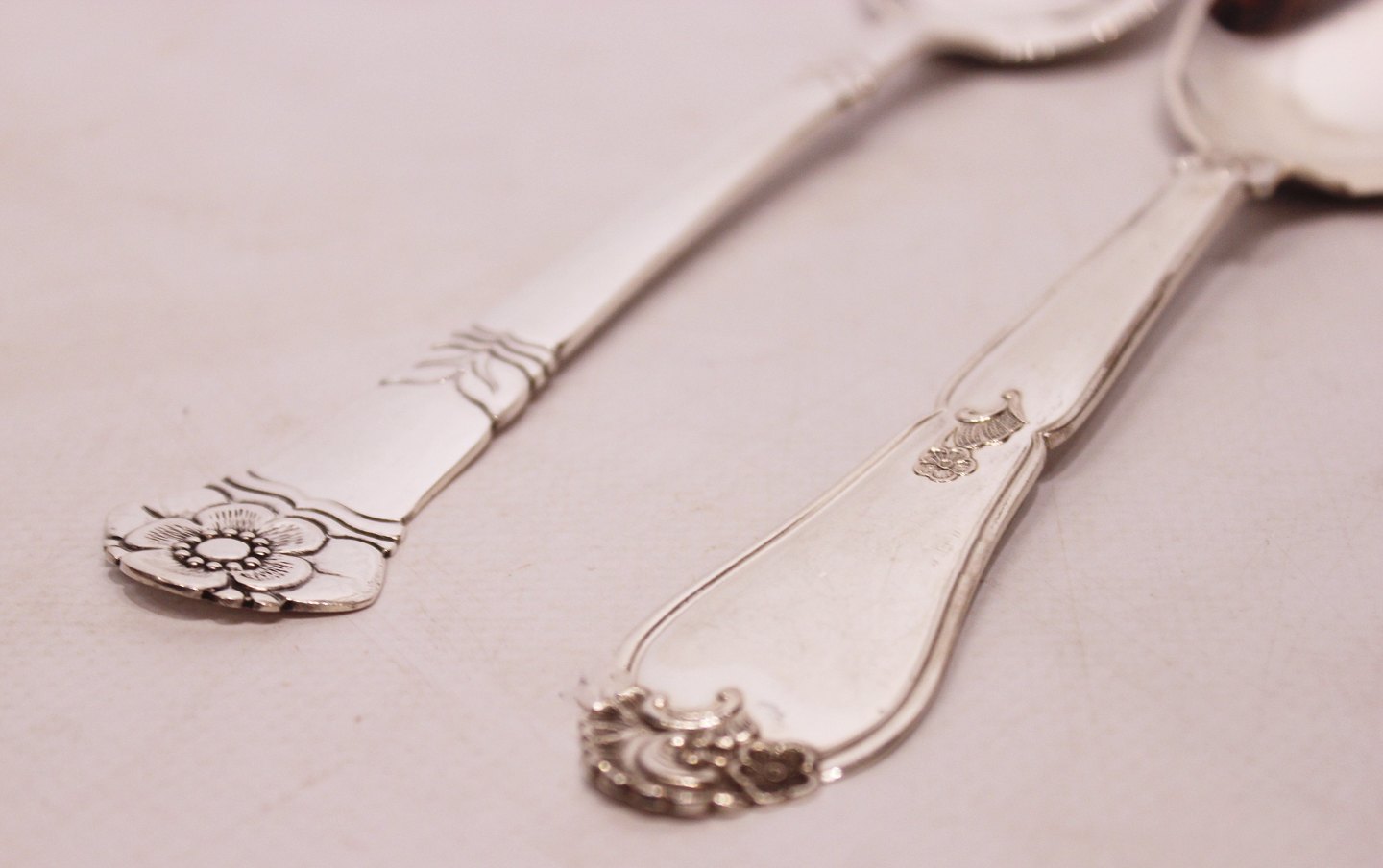 Dinner spoons in different patterns of hallmarked silver. Ask for number in stock.