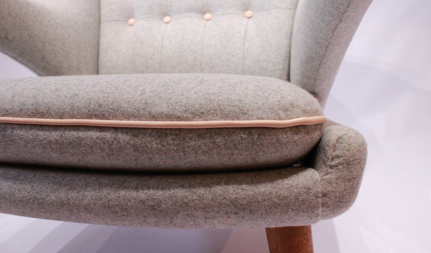SolgtBamsestol, Model AP 19, designet af Hans J. Wegner i 1951 og produceret af A.P. Møbler. Stolen er nypolstret med lyst uldstof, knapper af naturlæder og ben og "poter" er af eg.