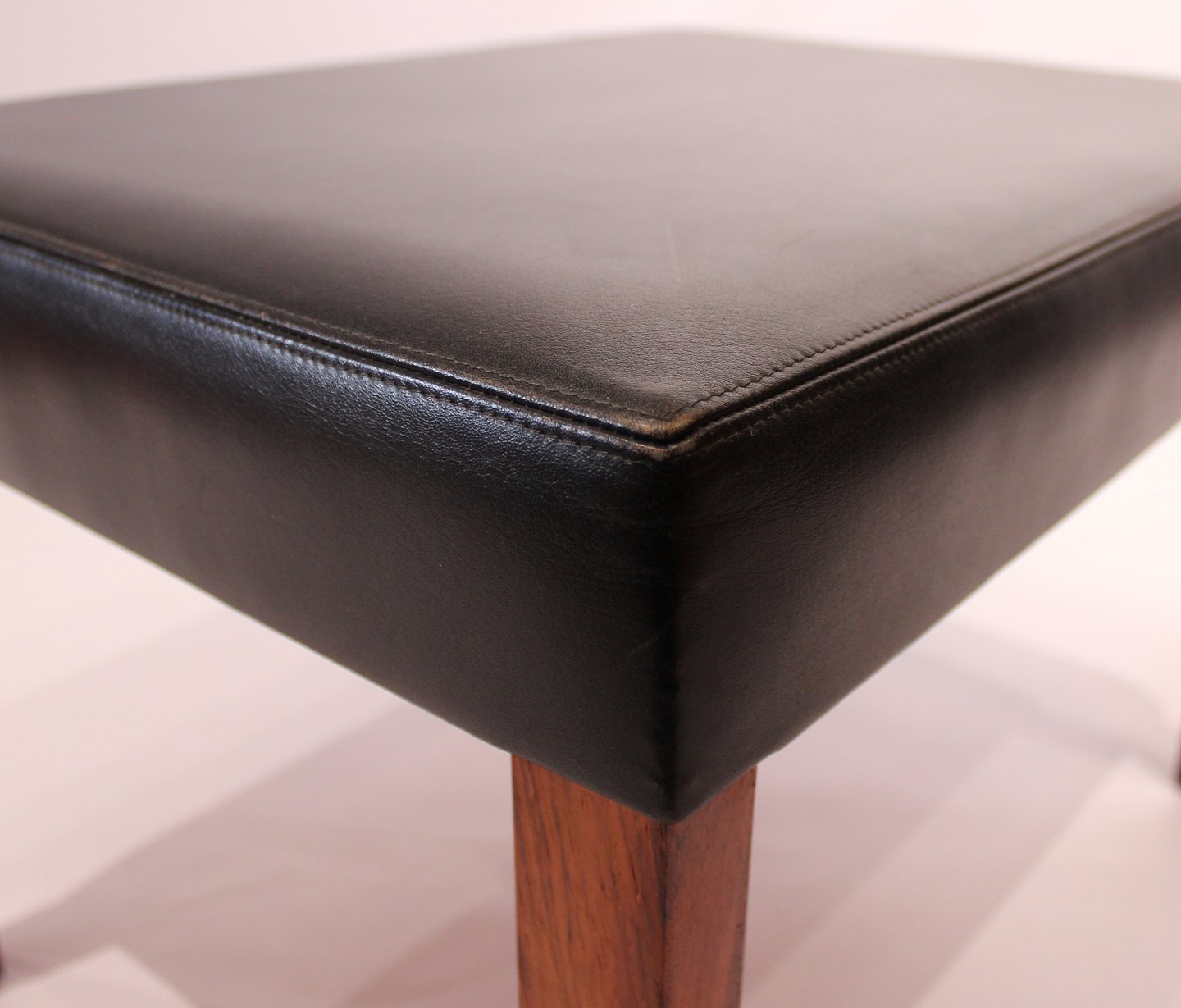 Skammel med ben af palisander og polstret med sort læder af dansk design fra 1960erne.