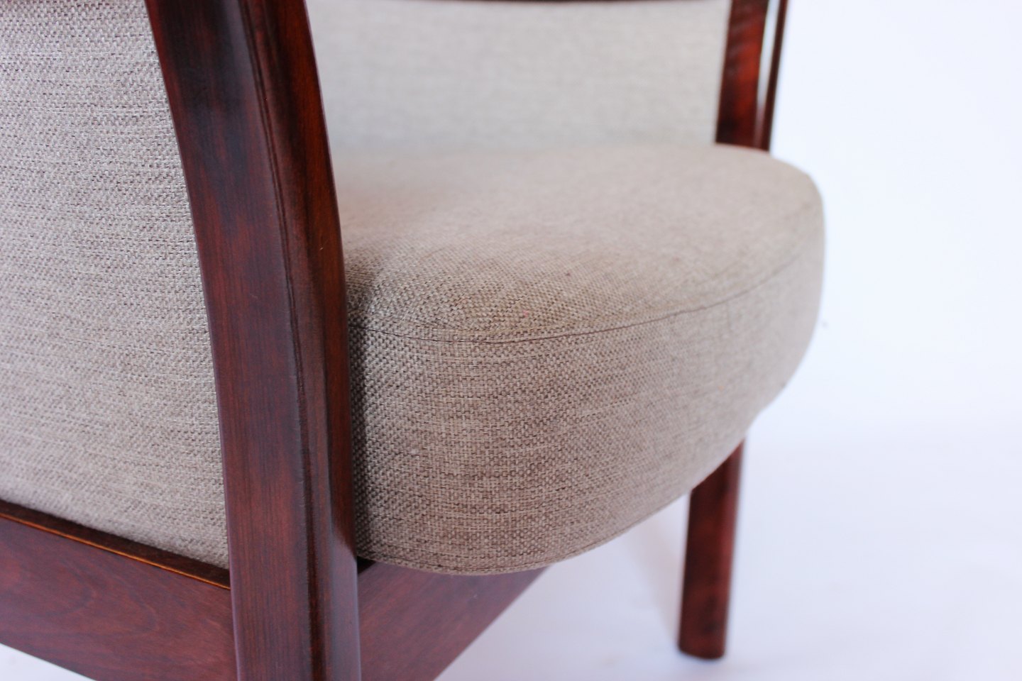 This set of two recliners with matching stools is the perfect combination of comfort, functionality and style. They have been newly upholstered in a beautiful light gray fabric, which adds a modern and fresh touch to the furniture. The dark wood contributes a warm and natural contrast to the light fabric, and it emphasizes the timeless design. The chairs are designed to recline for extra comfort and flexibility, and the height of the stools can be adjusted to meet individual needs. With their elegant appearance and practicality, this set of recliners and stools will be a welcome addition to any home where both comfort and aesthetics are valued.