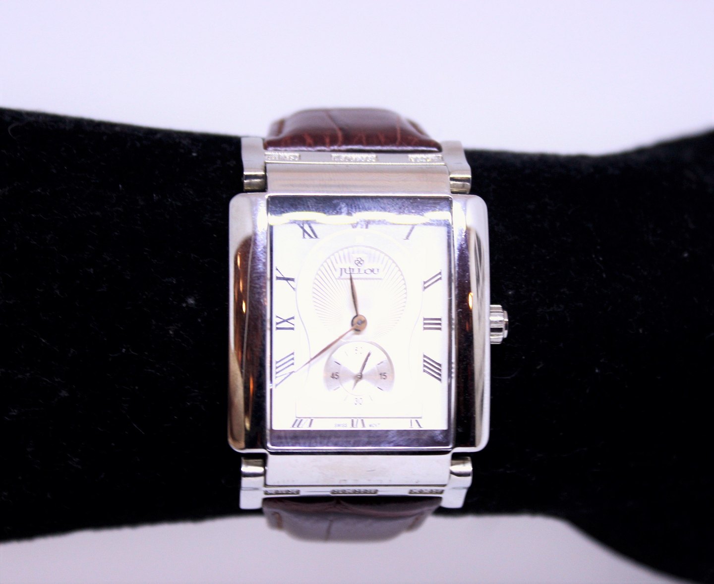 Jullou herre armbåndsur med swiss quartz urværk, urkasse af stål med 20 indbefattede diamanter og brun læderrem. Uret er i flot brugt stand.