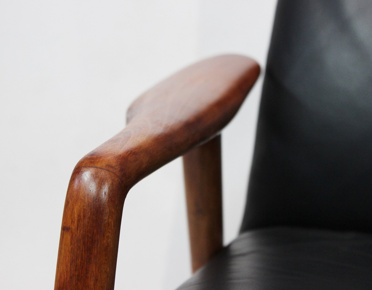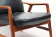 SolgtHvilestol af poleret træ og sort læder designet af Alf Svensson og fremstillet af Fritz Hansen i 1960erne. Stolen er i flot brugt stand og ryggen kan indstilles.