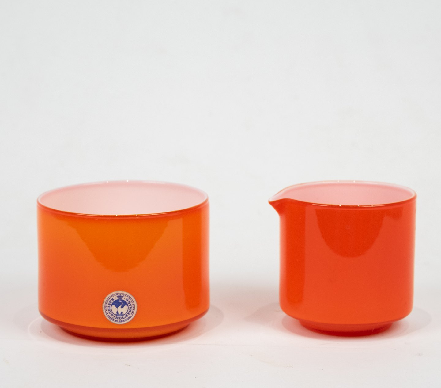 Orange glas sukkerskål og rød glas flødekande begge med hvidt opaline glas indvendigt fra Palet serien af Michael Bang for Holmegaard.