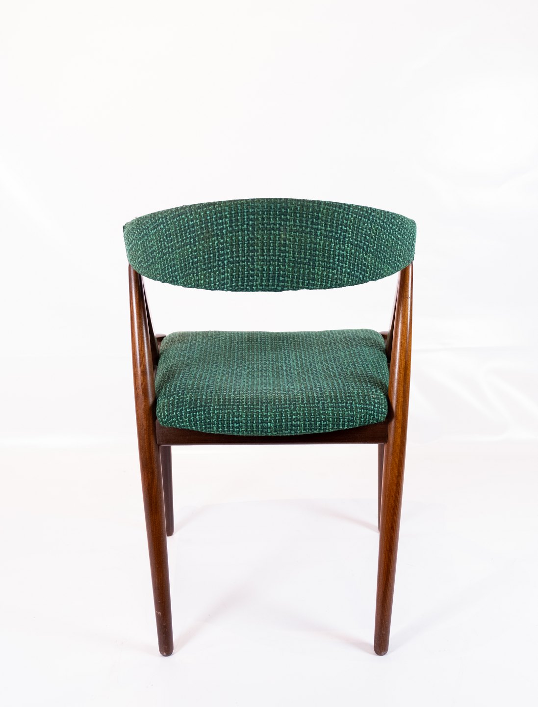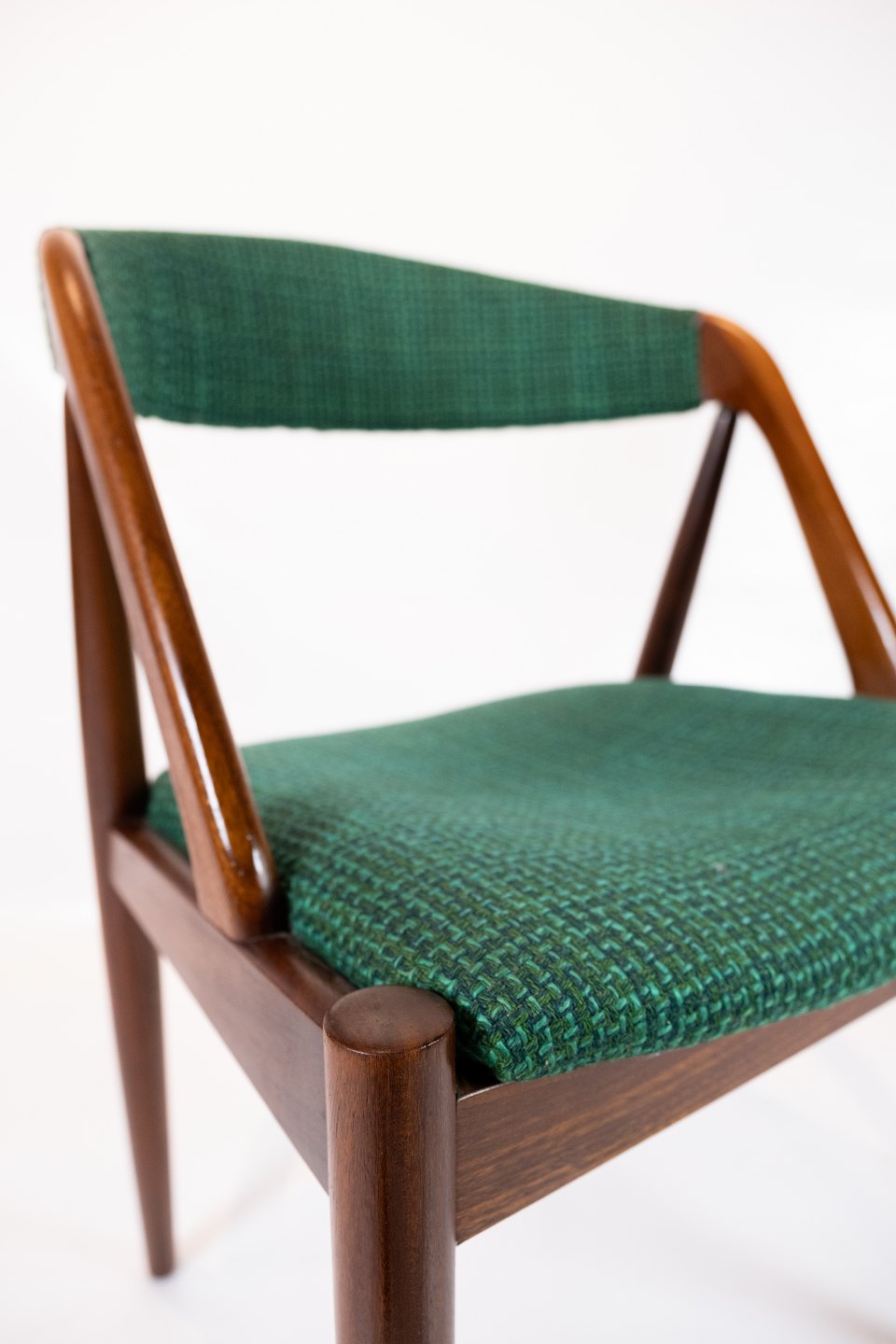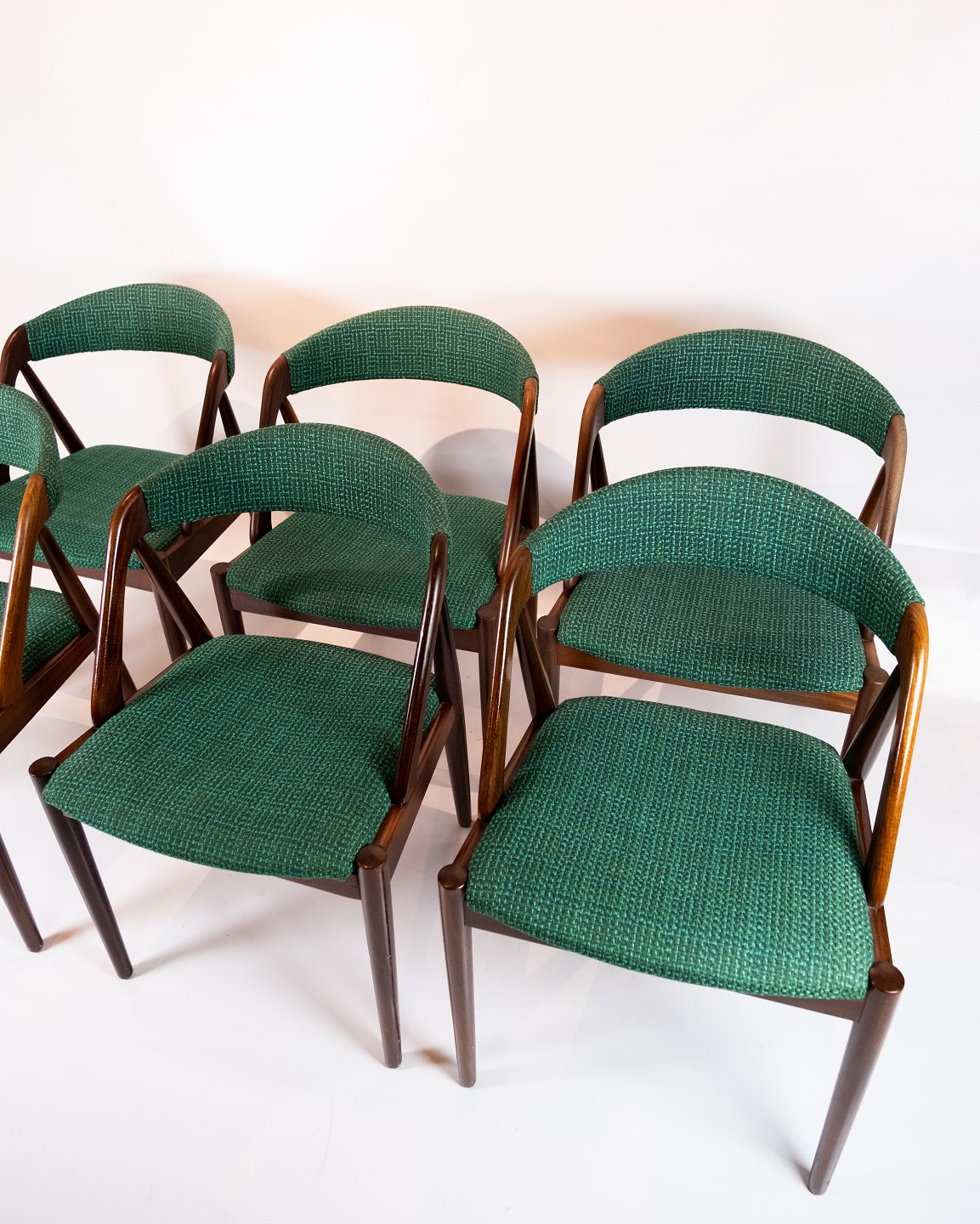 Et sæt af seks spisestuestole, model 31, designet af Kai Kristiansen i 1956 og fremstillet hos Schou Andersen i 1960erne. Stolene er i teak og polstret med mørkegrønt stof.