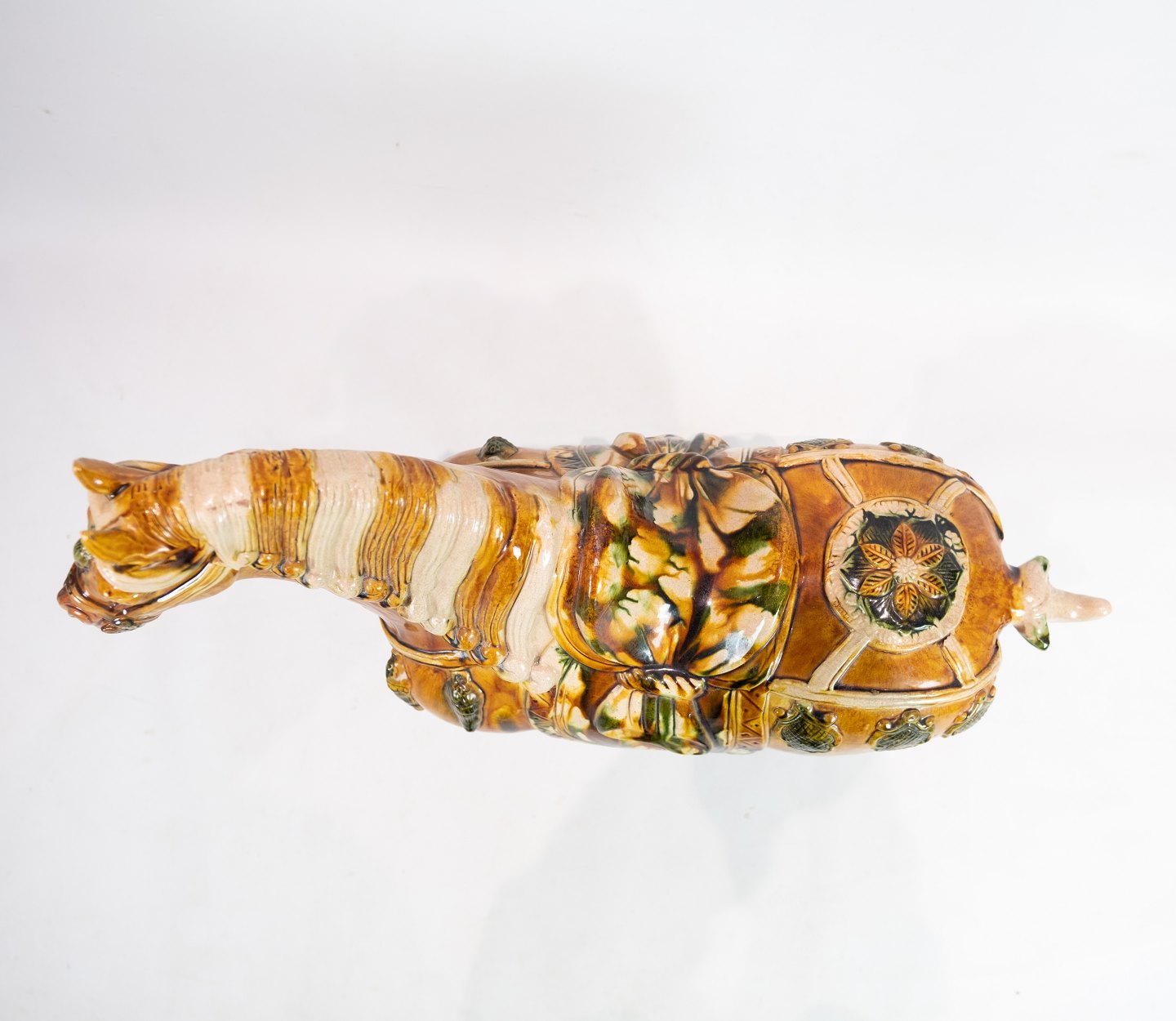 SoldLarge ceramic horse glazed in dark yellow nuances from China around the 1920s. The horse is in great vintage condition.