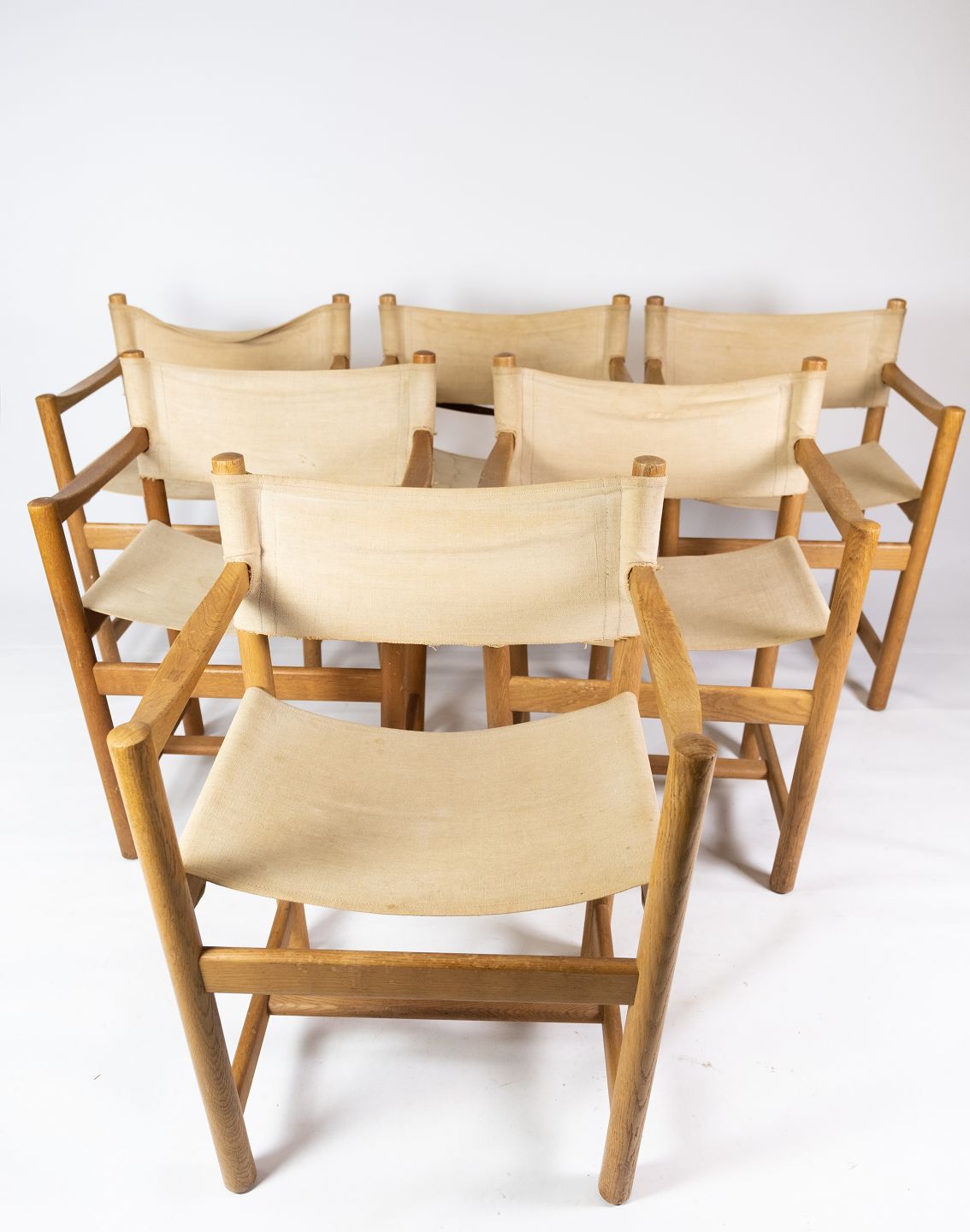 Sæt af seks foldestole, model J102, designet af Ditte & Adrian Heath for FDB møbler fra 1970erne. Stolene er af eg og lys canvas.