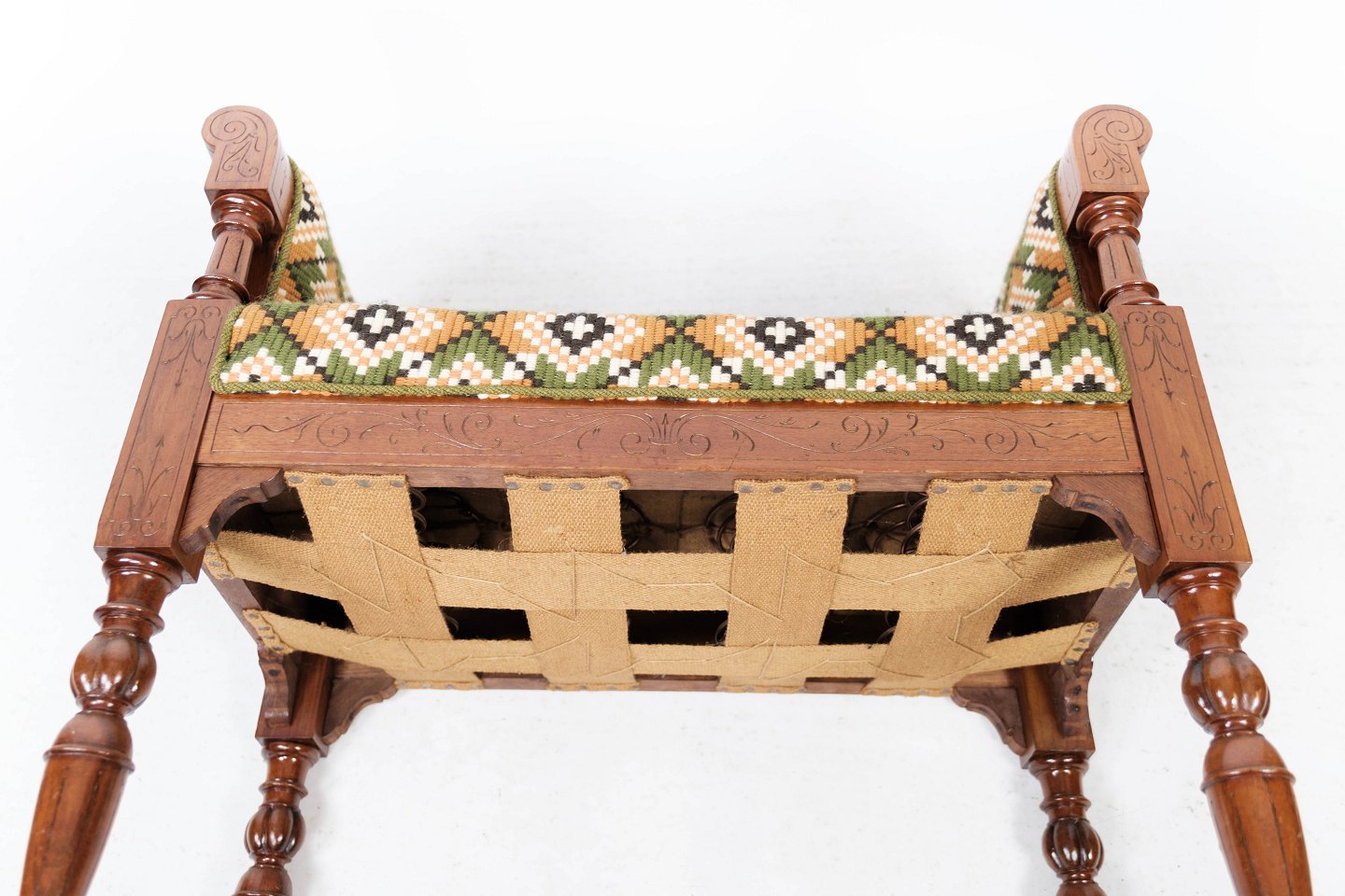Klaverbænk af valnød og polstret med mønstret stof, fra 1910erne. Møblet er i flot antik stand.