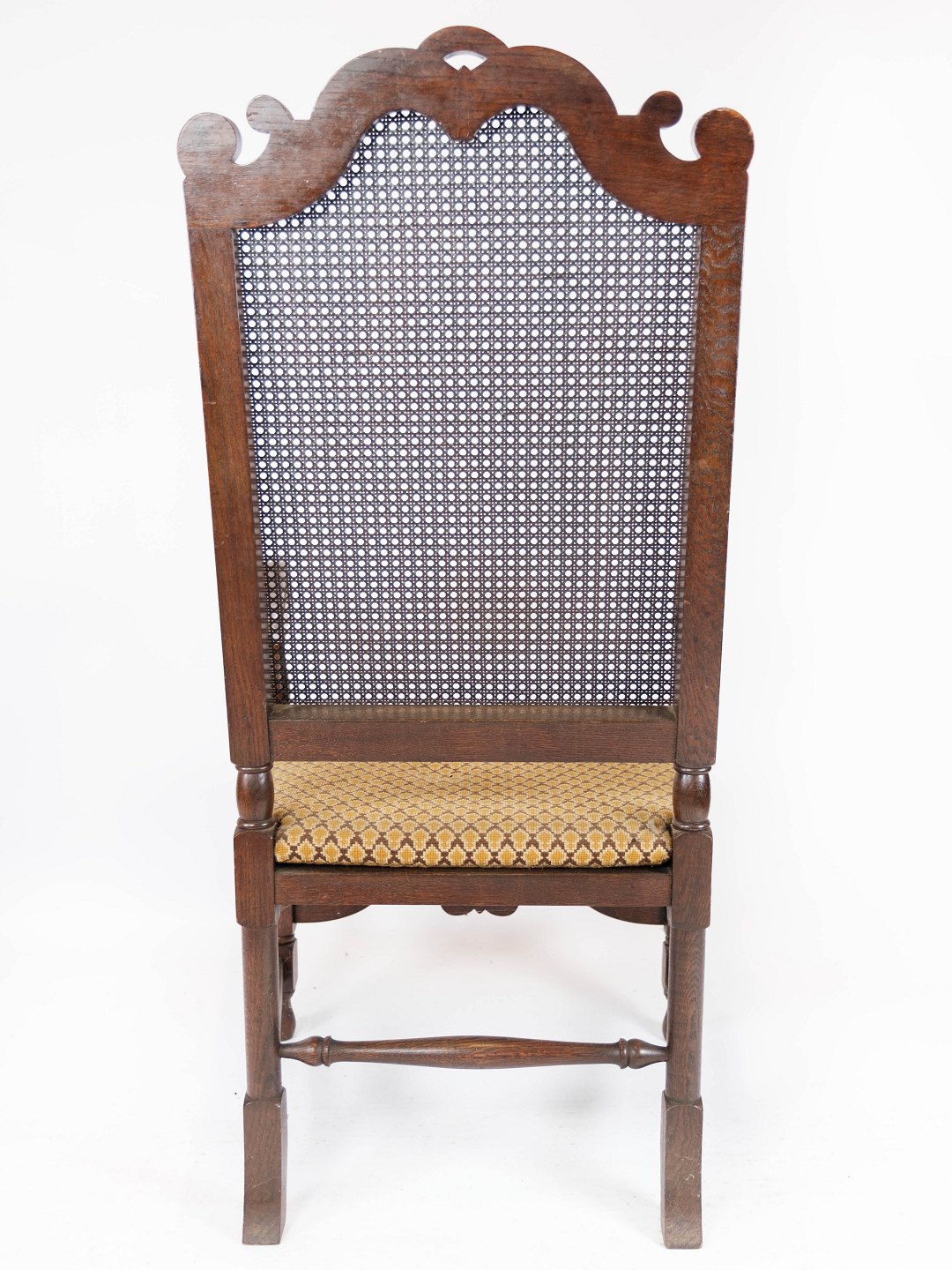 Antik armstol af eg, med original polstring af lyst stof og rørflet, fra 1920erne.