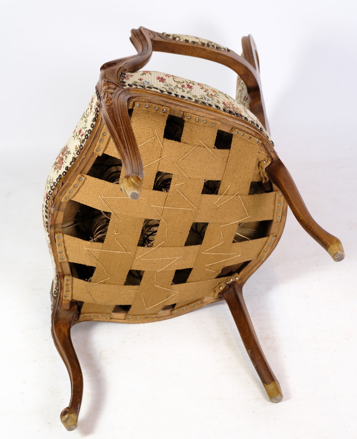 A pair of neo-rococo armchairs with decorative light wood fabric from around the 1930s is a beautiful representation of early 20th century furniture design and aesthetics. These chairs combine elegance and sophistication with a subtle lightness and charm characteristic of the rococo style.
