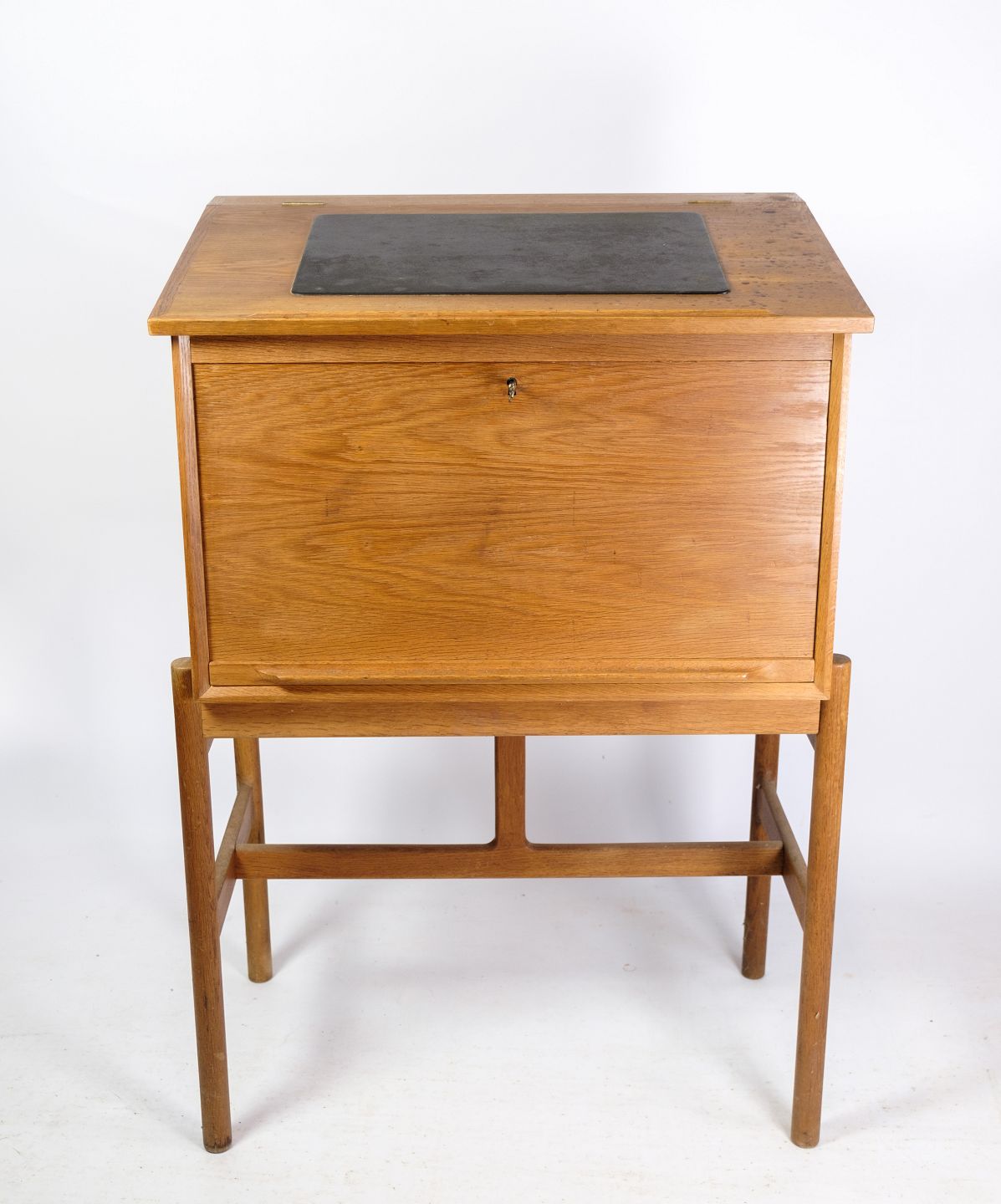 Skrivepulten er et godt eksempel på dansk møbeldesign fra 1960'erne, hvor funktionalitet og enkelhed var i fokus. Designet er slankt og elegant, og den enkle linjeføring giver et moderne udtryk. Den medfølgende nøgle tilføjer en ekstra sikkerhedsfunktion og et strejf af vintage-charme.