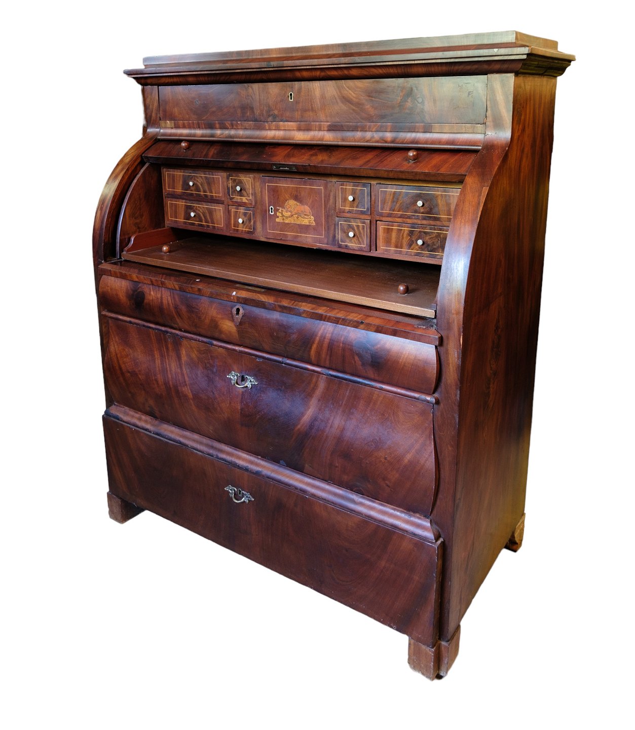 Chatol af Mahogni med fire skuffer og indvendig intarsia fra omkring år 1820'erne.