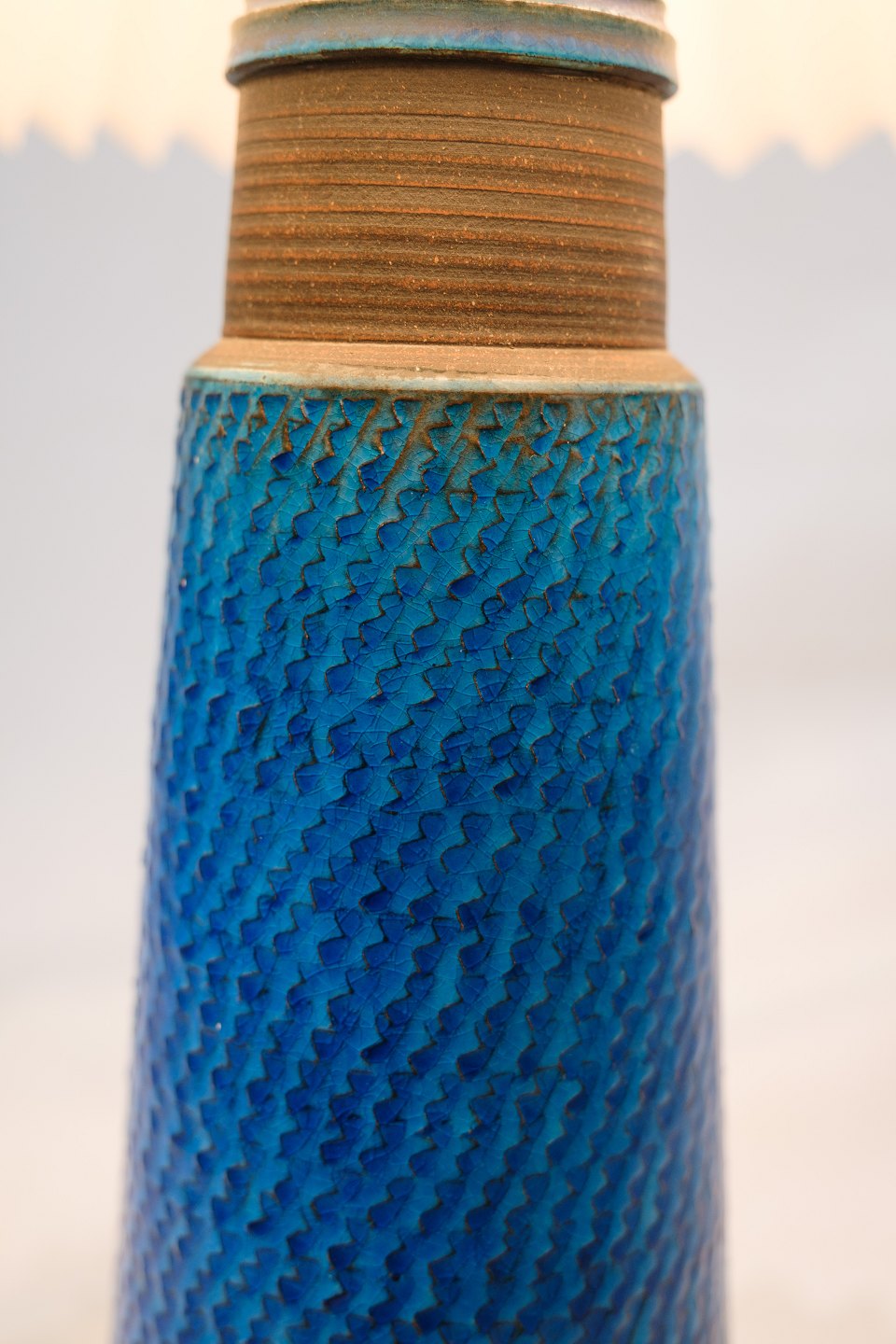 Dette sæt af to bordlamper er enestående eksempler på designskønhed, skabt af Nils Kähler og produceret af Herman A. Kähler. Lampens blå farve og sildebensmønster giver et umiskendeligt og charmerende udtryk, der skaber en unik atmosfære i ethvert rum.