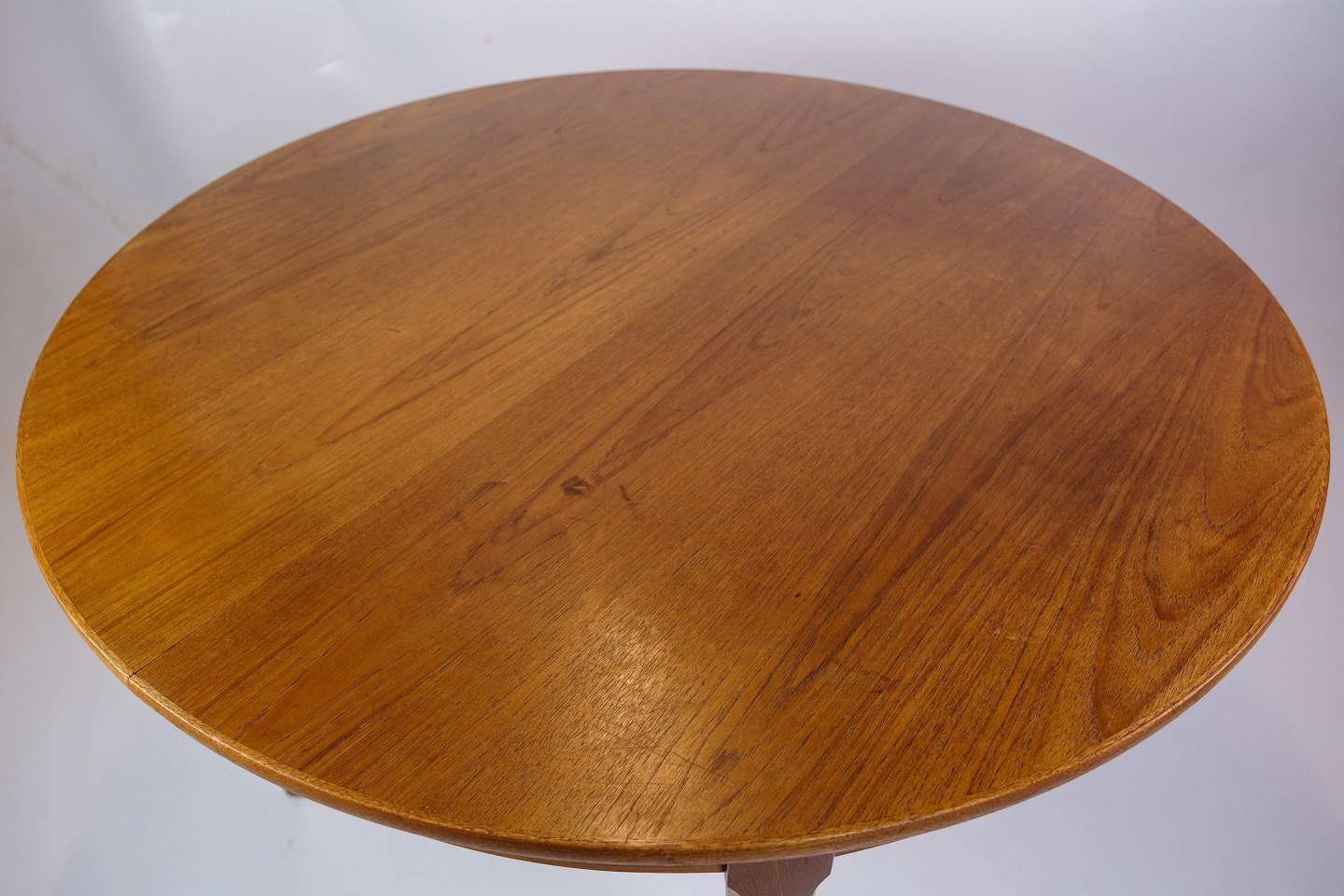 Bordpladen er lavet af teak, kendt for sin holdbarhed og smukke, varme farvetone. Teaktræets naturlige åretegninger og rige farve giver bordet en tidløs og sofistikeret æstetik. Den runde form gør det nemt at placere i forskellige rum og skaber en indbydende atmosfære, der er perfekt til sociale sammenkomster og familietid.