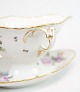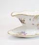 Sauceskål af Kongelig porcelæn med mønstret Saksisk blomst dekoreret i kanten med guld. Fremstillet af Royal Copenhagen i ca. 1923, hvor alle deres varer er blevet håndmalet og efterfølgende blevet meget sjældne. Sauceskålen står uden mangler eller defekter.