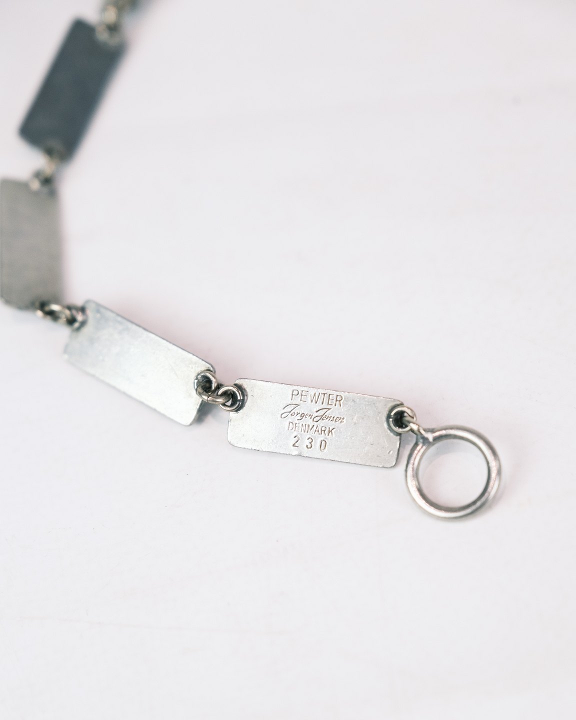 Halskæde i tin, udsmykket med rav, designet af Jørgen Jensen i 1960'erne. Jørgen Jensen, kendt for sit arbejde med pewter, skabte smykker, der kombinerede enkelhed og naturens skønhed. Denne halskæde er et tidløst eksempel på hans design, hvor det varme rav spiller smukt sammen med det kølige tin.