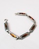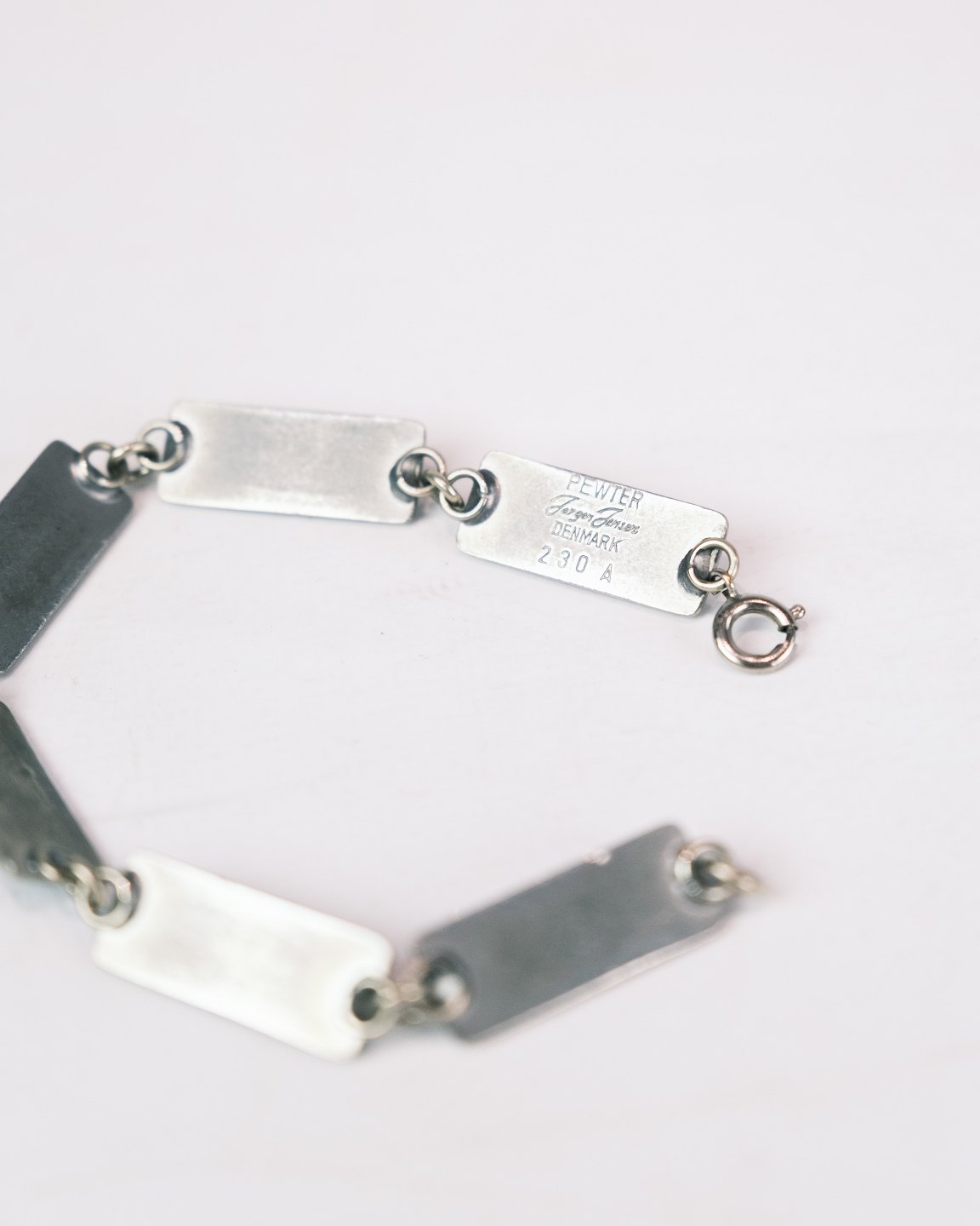 Armbånd i tin, udsmykket med rav, designet af Jørgen Jensen i 1960'erne. Jørgen Jensen, anerkendt for sine enkle og elegante smykker i pewter, skabte designs, der afspejler en harmonisk balance mellem materialer.