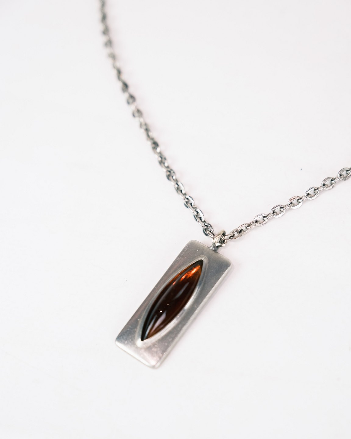 Necklace in tin, decorated with amber and with silver chain, designed by Jørgen Jensen in the 1960s. Jørgen Jensen, known for his pewter jewellery, created works that elegantly combined simplicity with the elements of nature. This necklace combines the warm amber with the cool tin, while the silver chain adds an extra layer of sophistication, making it a timeless and stylish piece from the 1960s.