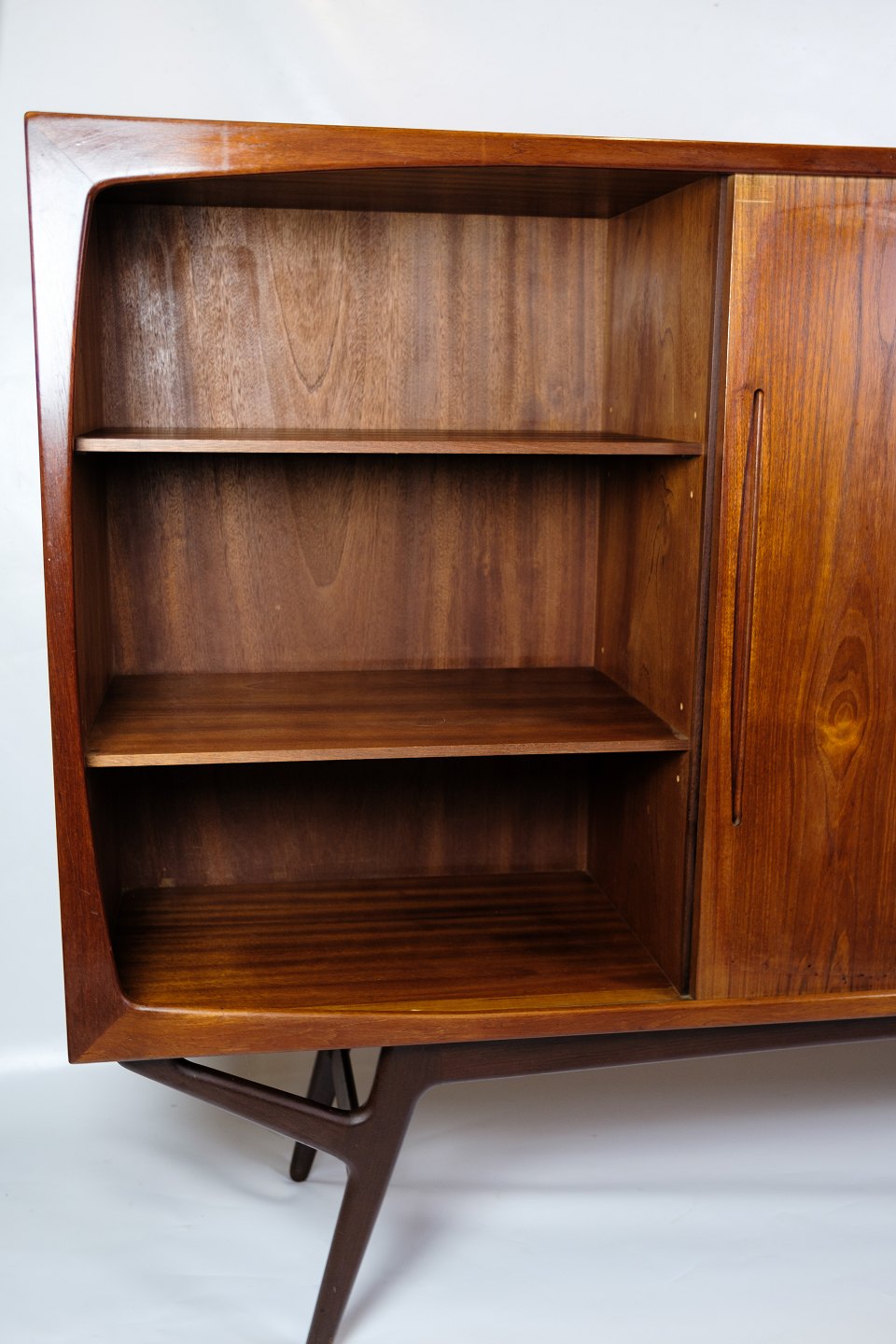 Super velholdt og flot skænk, designet af Harry Østergaard for Randers Møbelfabrik udformet i palisander træ i 1950'erne. Denne skænk er meget speciel grundet dens design og hvordan designet af benene på skænken er fremstillet til at stabilisere skænken. Skænken er meget funktionsdygtig med opbevaringsplads i begge sider med hylder og i midten fire skuffer med kvalitetsgreb og indvendig glashylde.