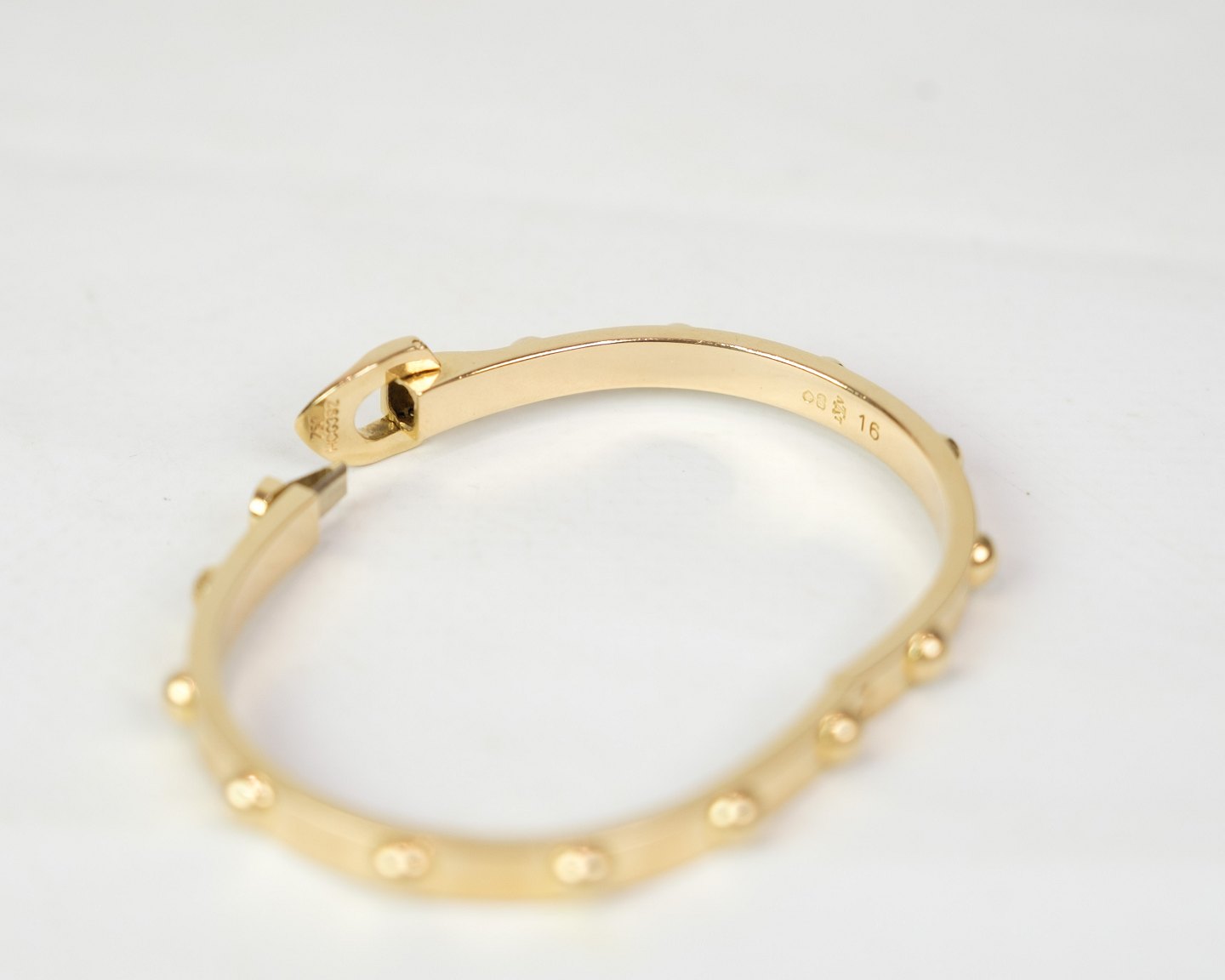 18 karat guld armbånd udsmykket med en diamant fra Louis Vuitton fremstillet i Frankrig. Armbåndet har 2 stempler 750 & 16, som indikere at armbåndet er lavet af 18 karat guld og størrelsen.
