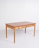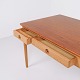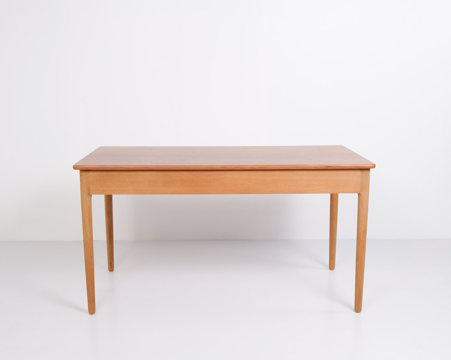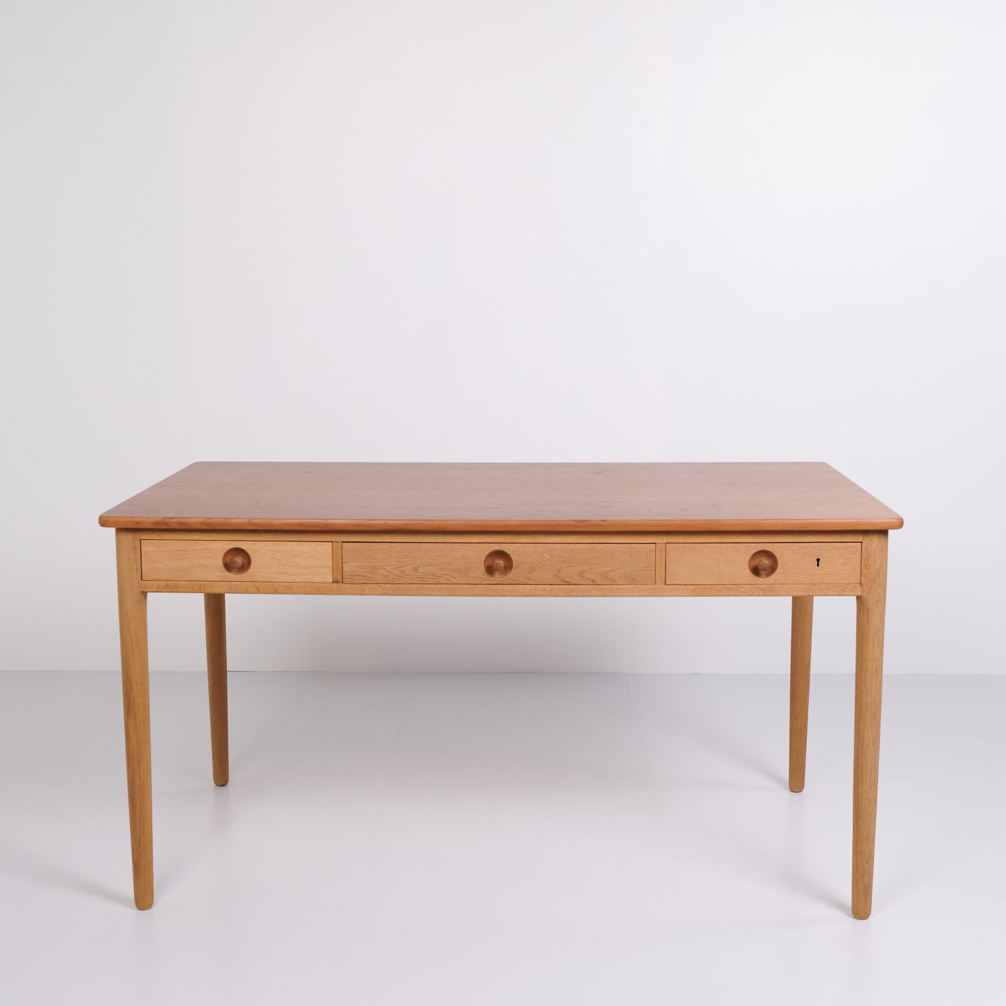 Kontakt os vedrørende prisSkrivebord designet af Hans J. Wegner og produceret af Andreas Tuck i 1960’erne. Bordet er udført i teak med benkonstruktion i eg – en klassisk materialekombination, der fremhæver Wegners sans for proportioner og naturlig balance. Bordet har skuffer i fronten.