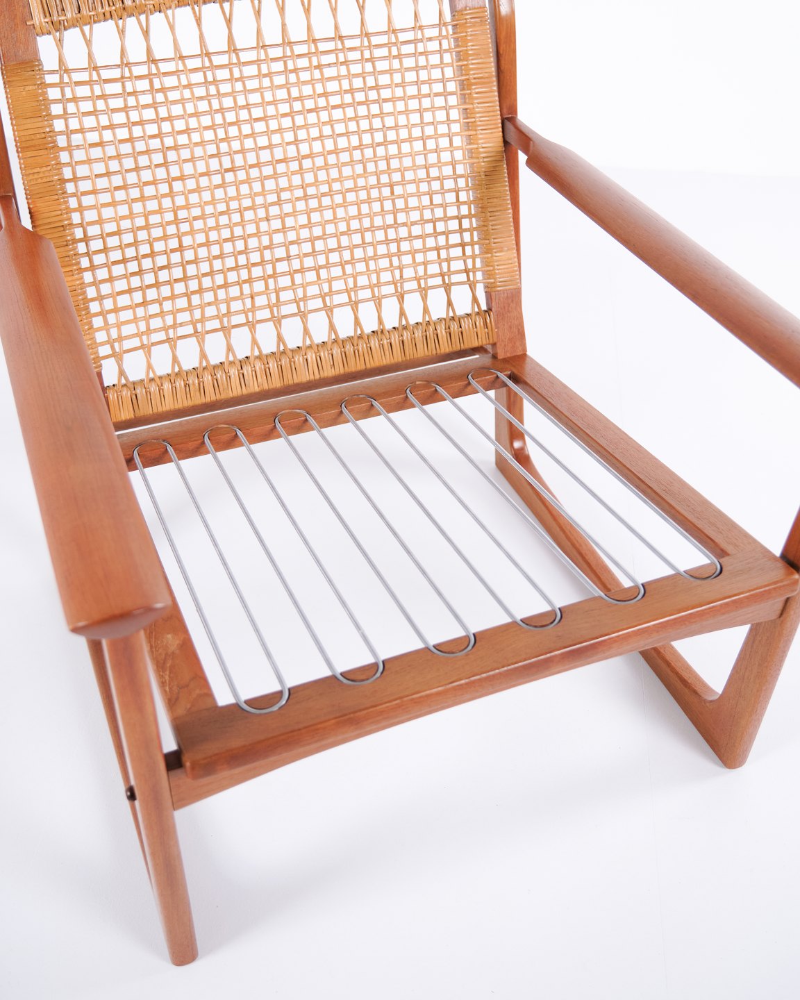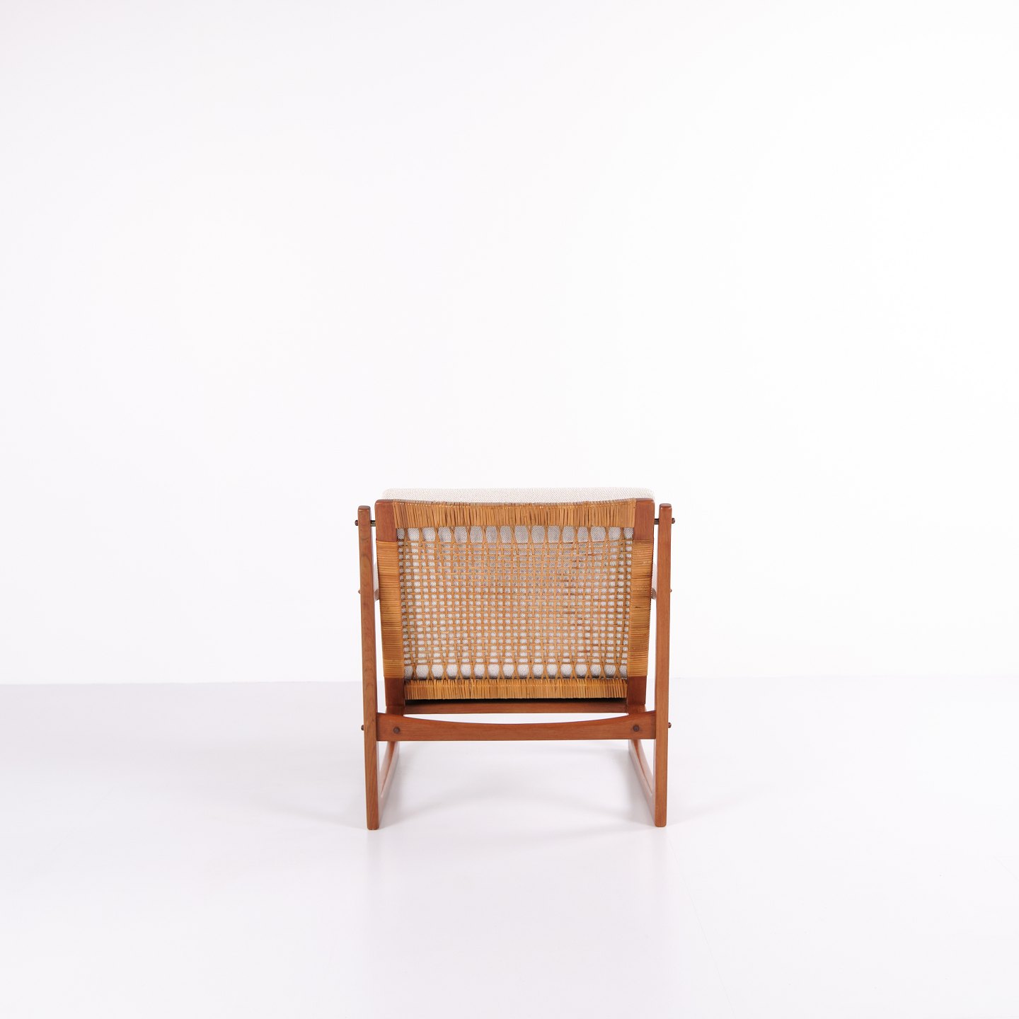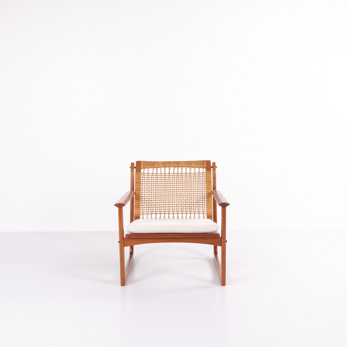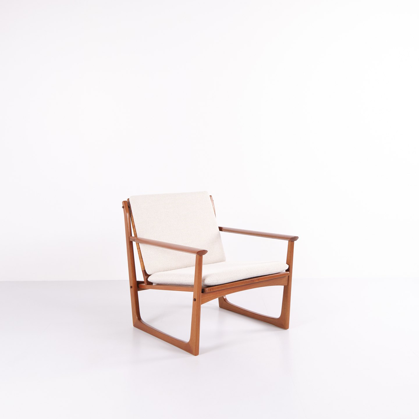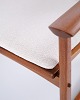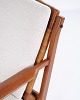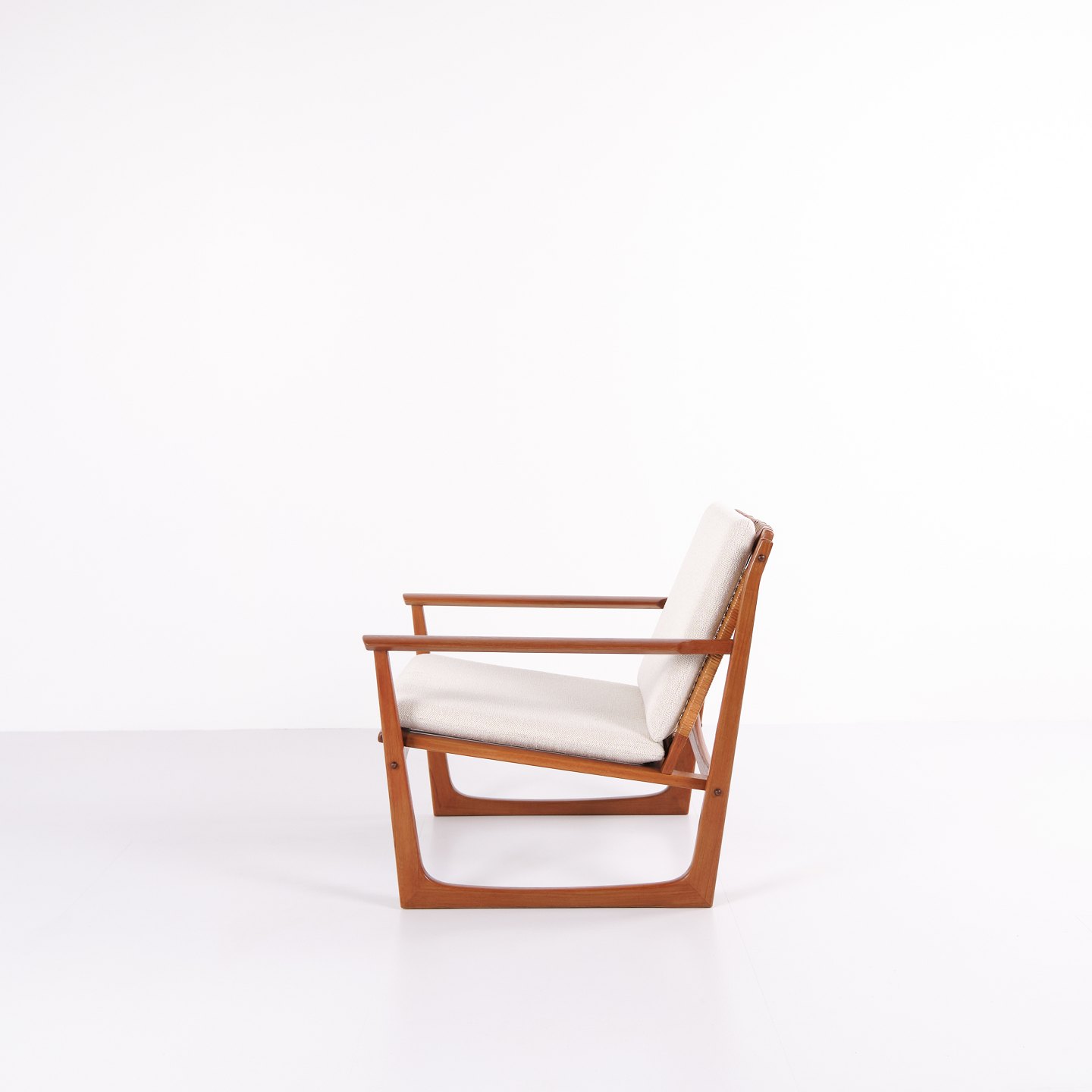 Lænestol designet af Hans Olsen og produceret af Selig i 1960’erne. Stolen er udført i massiv teaktræ med smukt formede armlæn og ben, betrukket med lyst stof, der fremhæver det varme træ og det harmoniske formsprog.